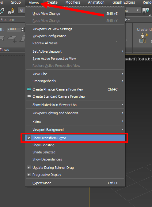 5)상단의 views 메뉴에서 show transform gizmo에 체크되어있는지 확인합니다.
