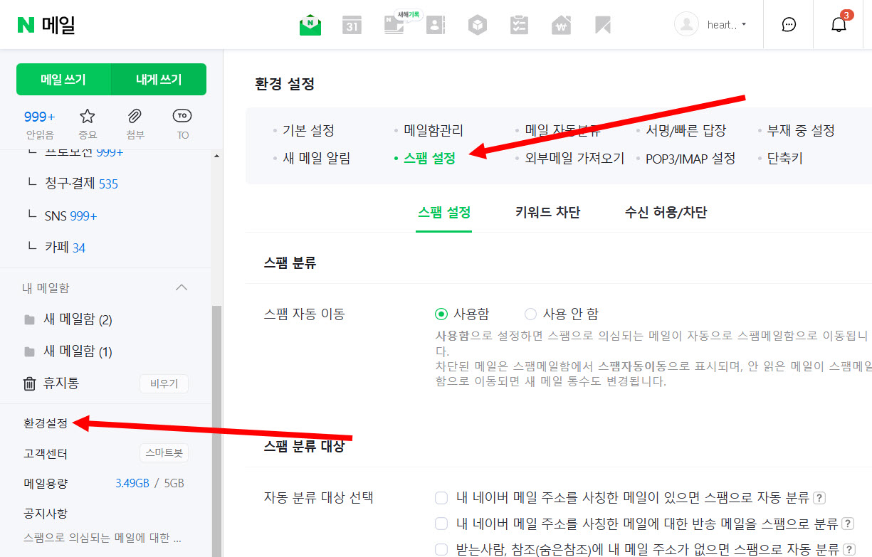 2)좌측의 환경설정 메뉴에서 스팸 설정으로 이동합니다.