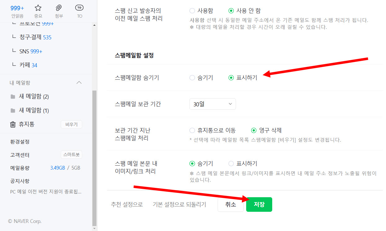 3)스팸 메일함 설정에서 표시하기에 체크하고 저장합니다.