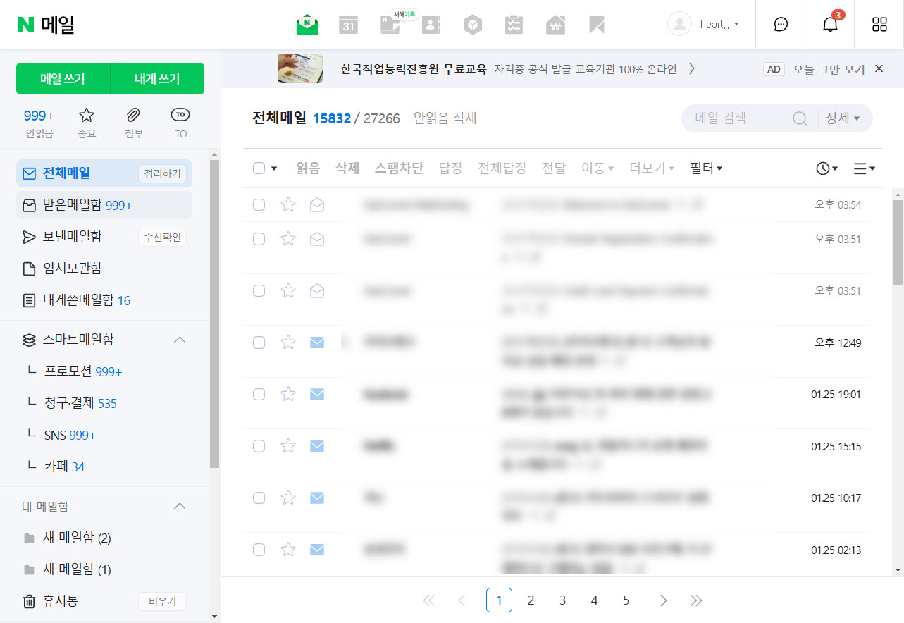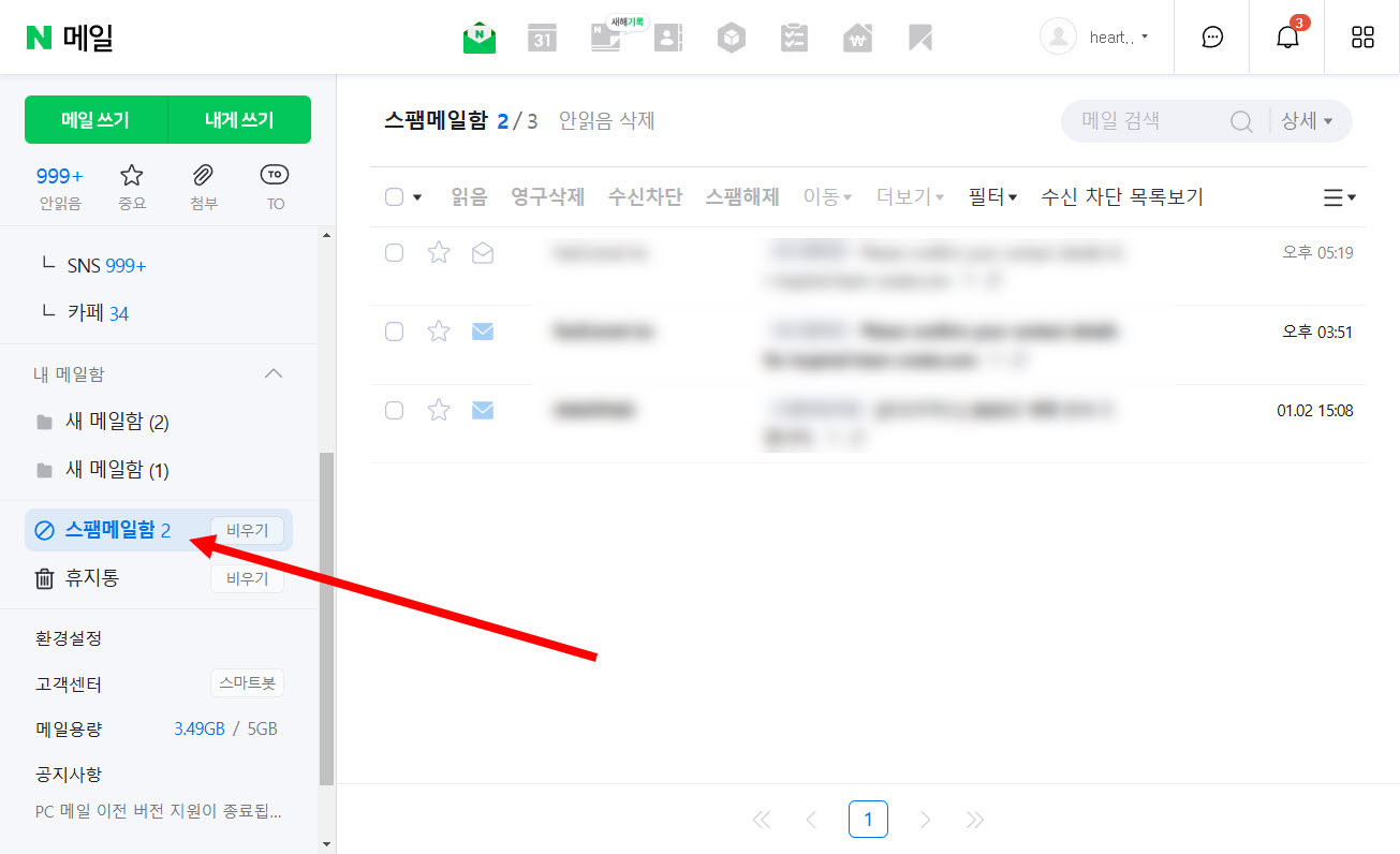 4)페이지를 새로고침하면 좌측에서 스팸메일함을 표시합니다.