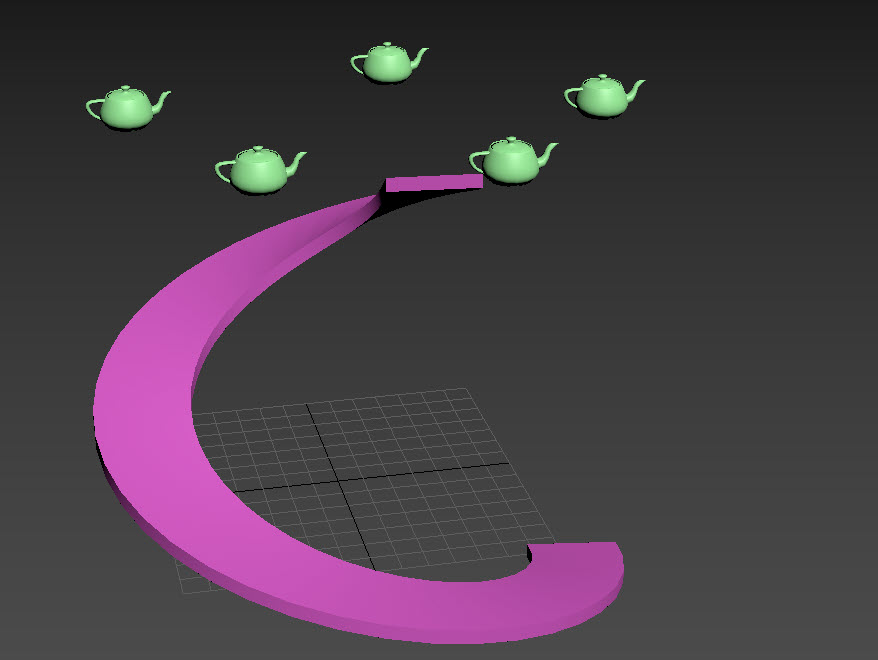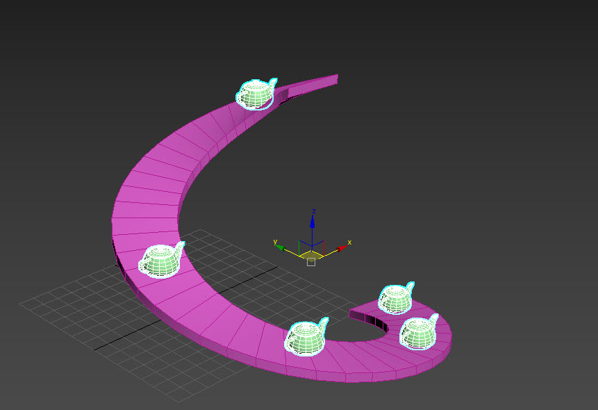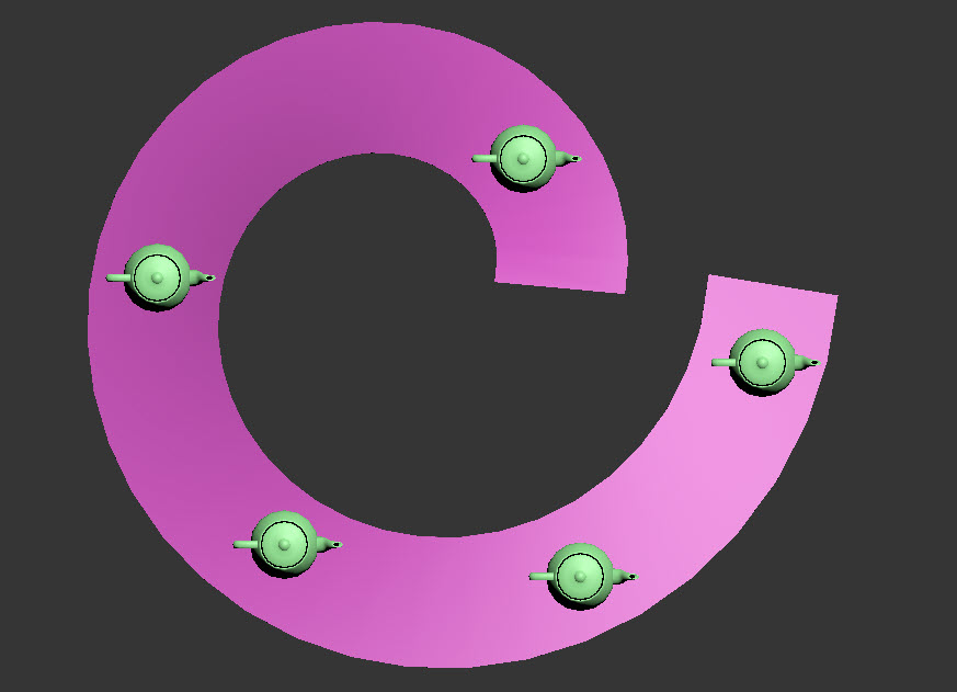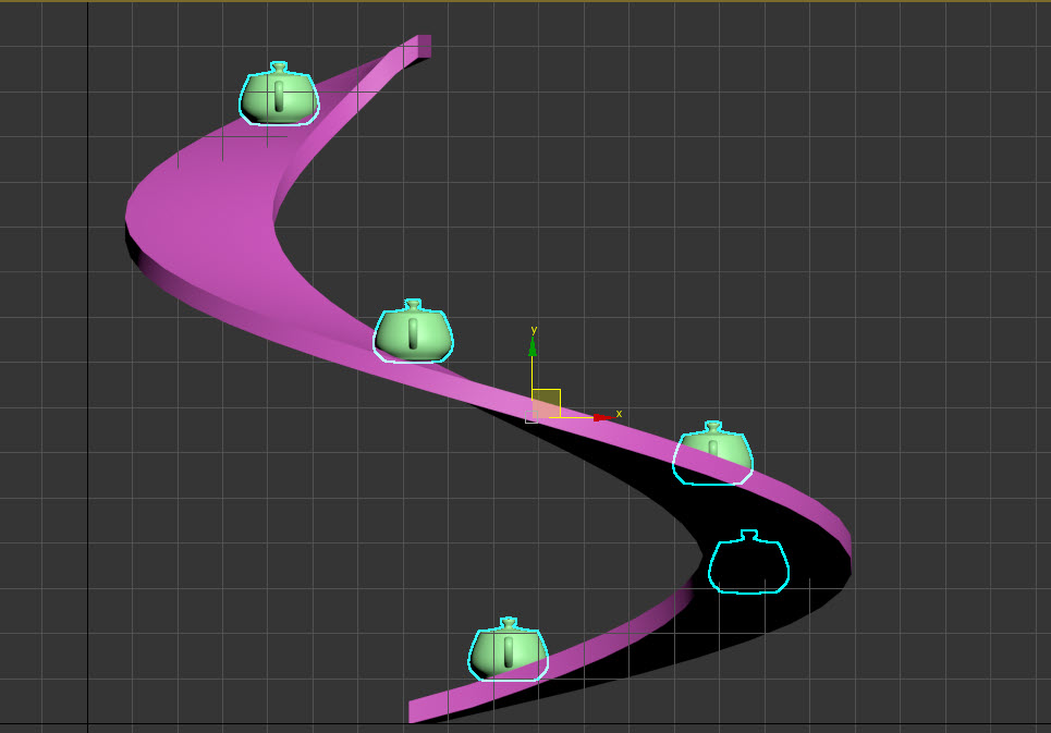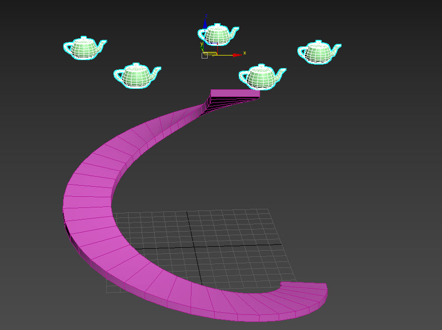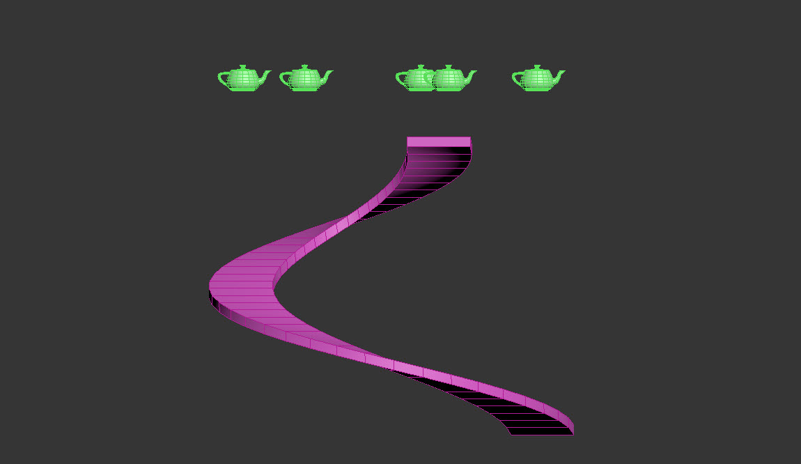 2)곡선형 지오메트리 오브젝트(Helix) 또는 지형 오브젝트와 정렬시킬 다수의 오브젝트(Teapot)를 준비합니다.