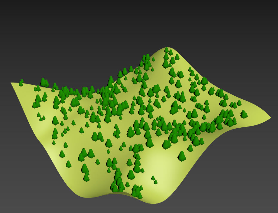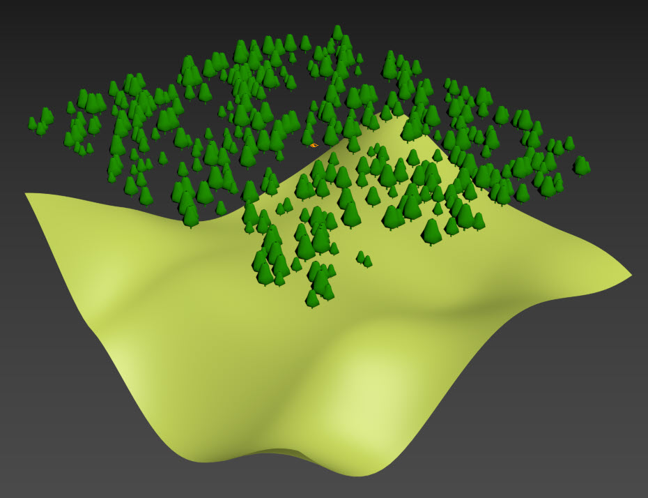 6)선택한 모든 오브젝트가 지형 오브젝트 표면에 정렬 및 배치된것을 확인할수있습니다.