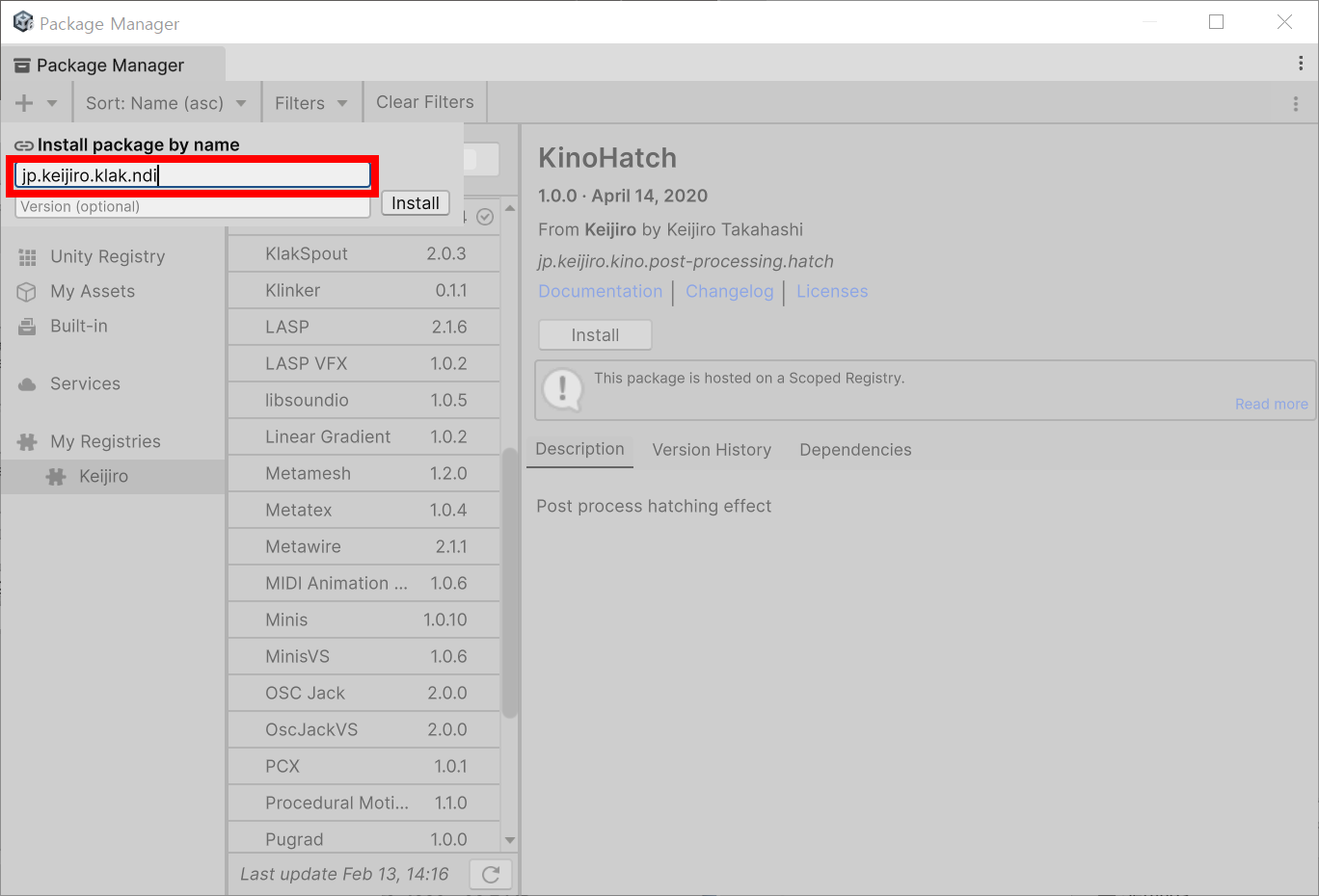 2)패키지 관리자의 my registries에서 추가한 레지스트리를 확인할수있으며 해당 레지스트리 및 패키지 콜렉션 제공자(Keiijiro)의 모든 공개 패키지를 설치할수있습니다.