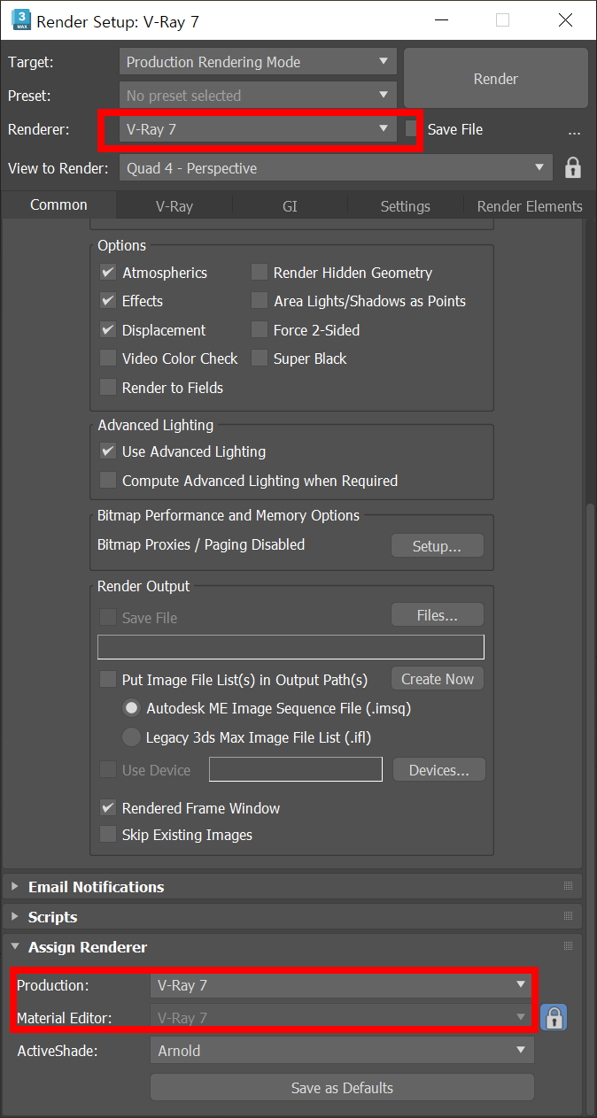 1)렌더 설정(render setup)에서 브이레이 렌더러를 선택합니다(V-Ray)