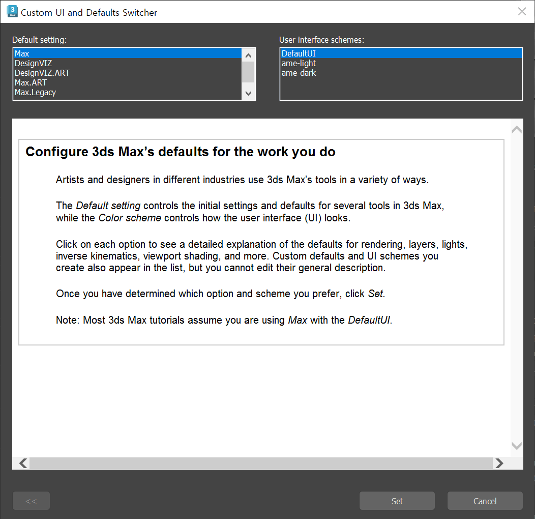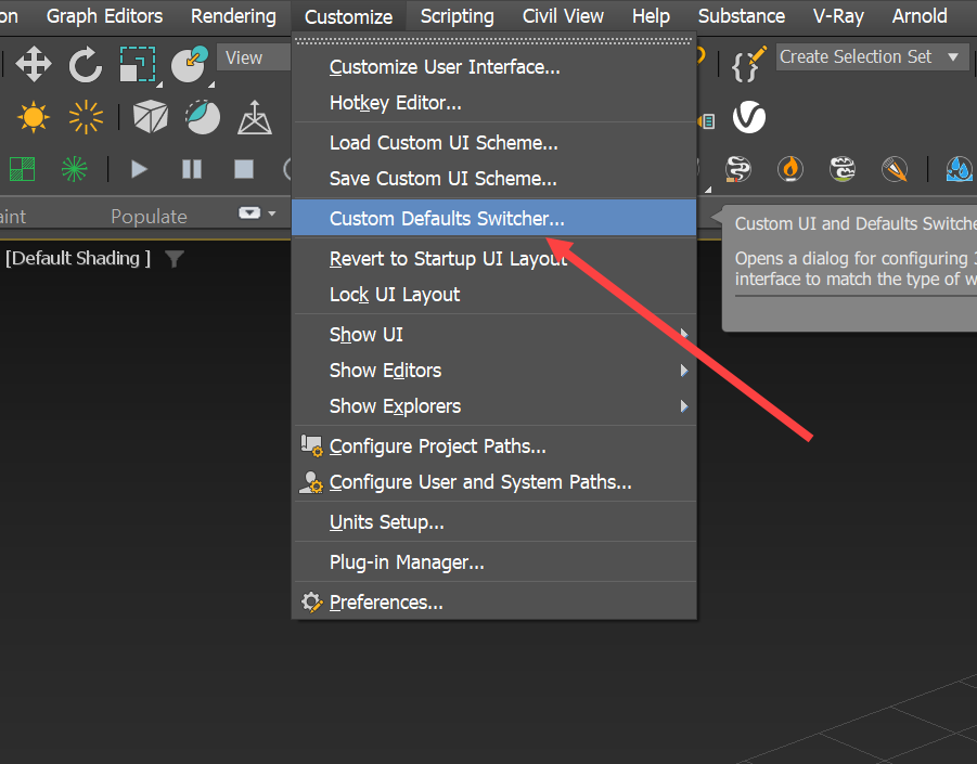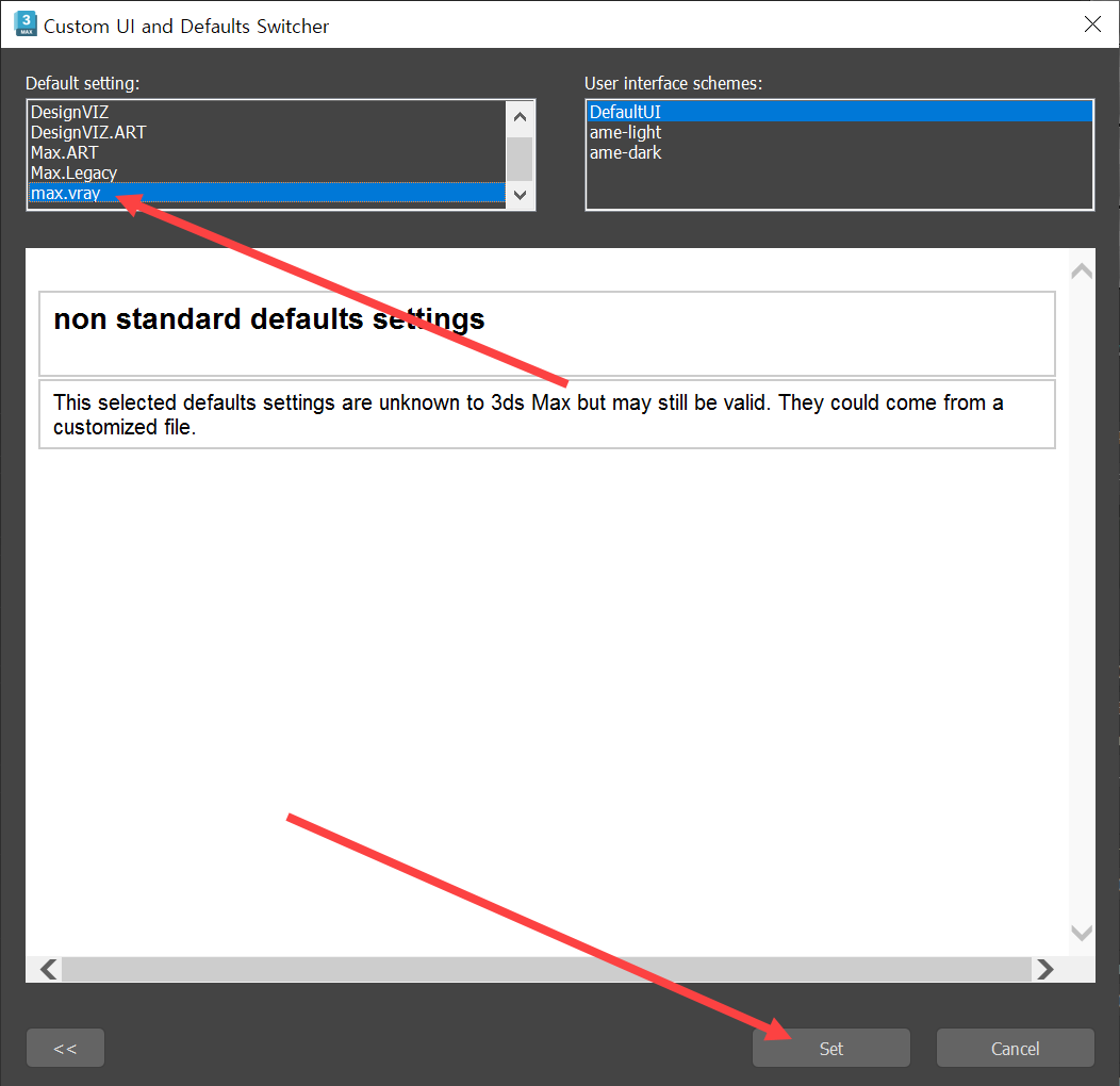 5)default settings를 max.vray로 변경하고 설정합니다(set)