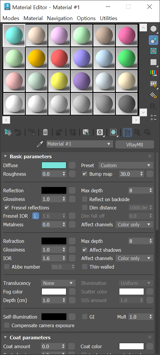 3D 맥스 브이레이(V-Ray) 재질 편집기 모두 브이레이 재질(VRayMtl)로 설정