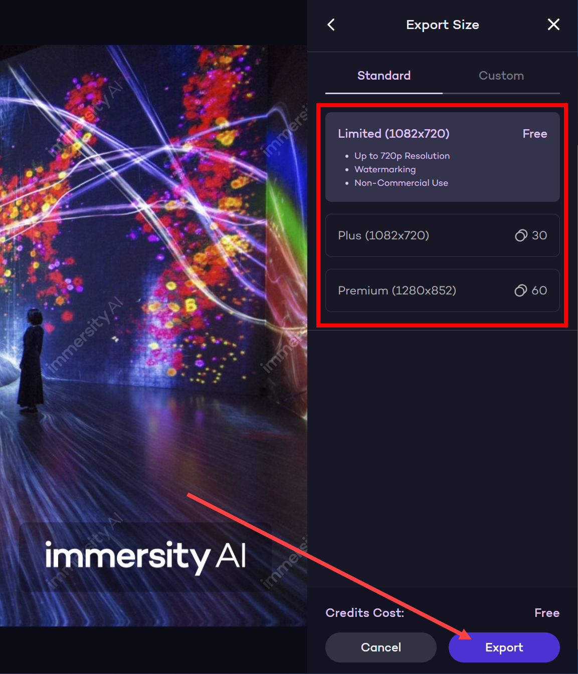 9)가입 유형을 선택하고 export를 클릭합니다. 무료 버전인 Limited는 최대 720p 해상도, 워터마크 삽입, 비상업적 용도로 이용가능합니다.