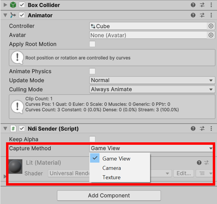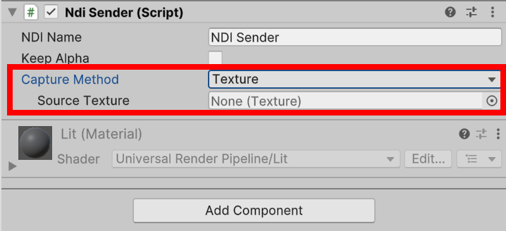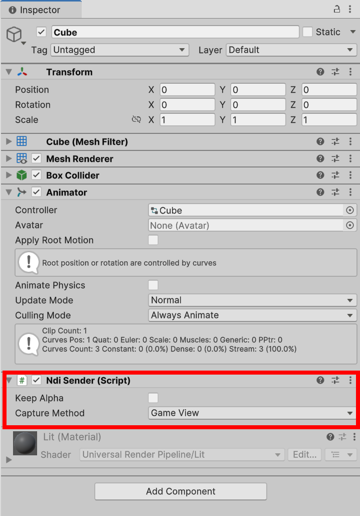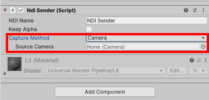 4)게임 오브젝트에 Ndi Sender(또는 Ndi Receiver) 스크립트를 추가합니다.