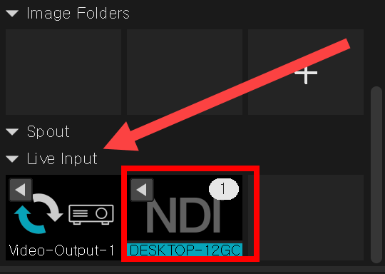 9)매드맵퍼 미디어 패널의 라이브 입력(Live Input)에서 NDI를 확인할수있으며 뷰 패널에서 실시간 전송하는 비디오를 확인할수있습니다.