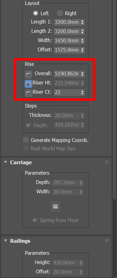 기본적으로 Rise Ht의 핀이 활성화되어있는것을 확인할수있습니다. 핀을 활성화하면 해당 속성의 값을 고정하고 다른 속성을 조절하여 계단의 높이를 설정합니다.