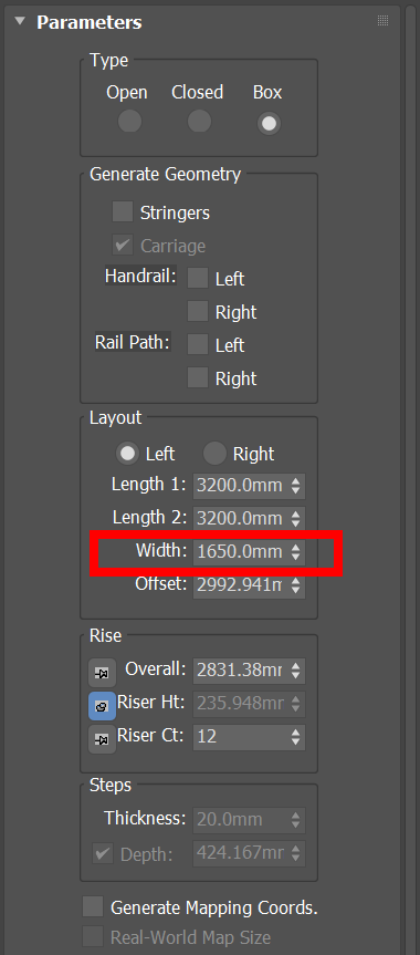 5)계단의 전체 폭을 설정하려면 Width 수치를 입력합니다.