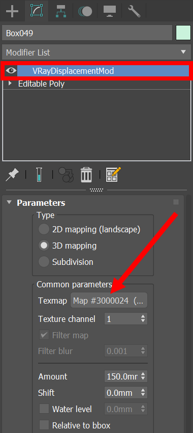 3)오브젝트에 브이레이 VRayDisplacementMod 수정자를 추가하고 텍스처 맵을 참조합니다.