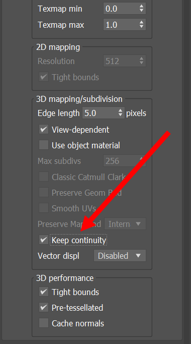 5)VRayDisplacementMod 수정자에서 Keep continuity 속성에 체크합니다.
