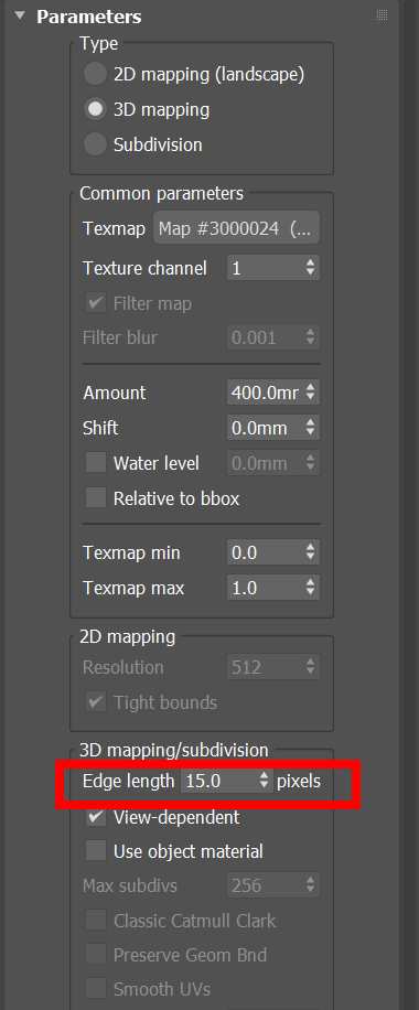 2)VrayDisplacementMod 수정자에서 3D mapping/subdivision의 edge length에 적절한 수치를 사용하여 Displacement 이전의 subdivision(세분화) 수준을 설정할수있습니다. edge length는 subdivision에서 하위 삼각형 모서리의 최대 길이로 이 값이 클수록 하위 삼격형의 개수가 적어서 세부 정보 표현 정도가 낮아집니다.