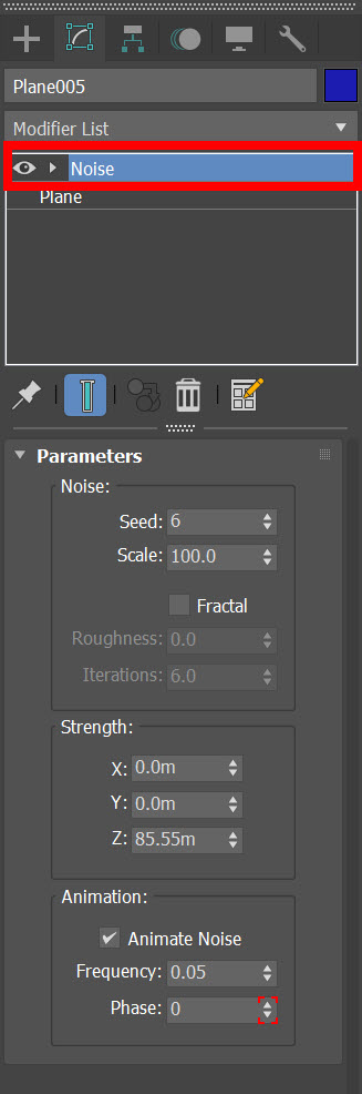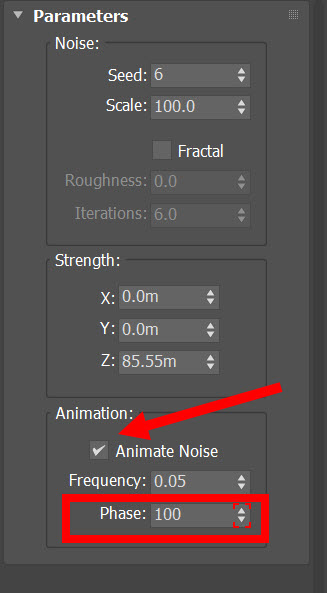 3)Animation의 Phase에 키 프레임을 추가하여 노이즈 애니메이션을 설정합니다(또는 기타 수정자의 파라미터에 키 프레임 애니메이션을 설정합니다)