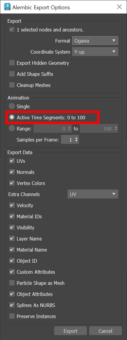 13)내보내기 옵션(export options)에서 Animation의 Active Time Segments를 선택하고 내보내기합니다(export)