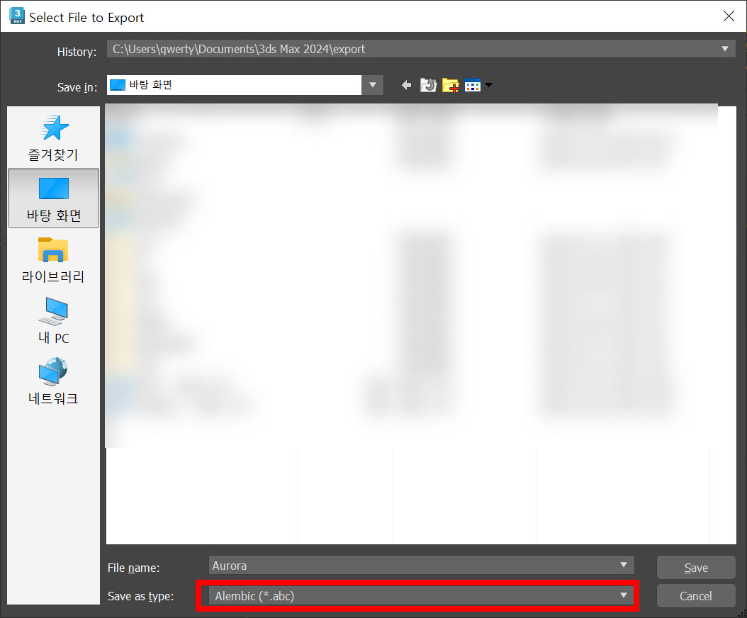 12)Alembic(.abc) 파일 형식을 선택하고 저장합니다.