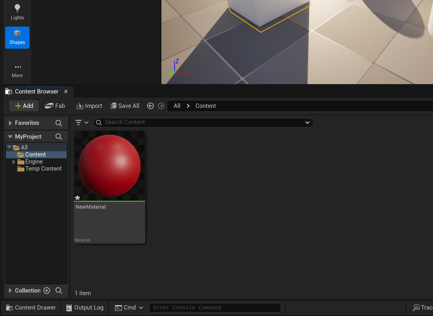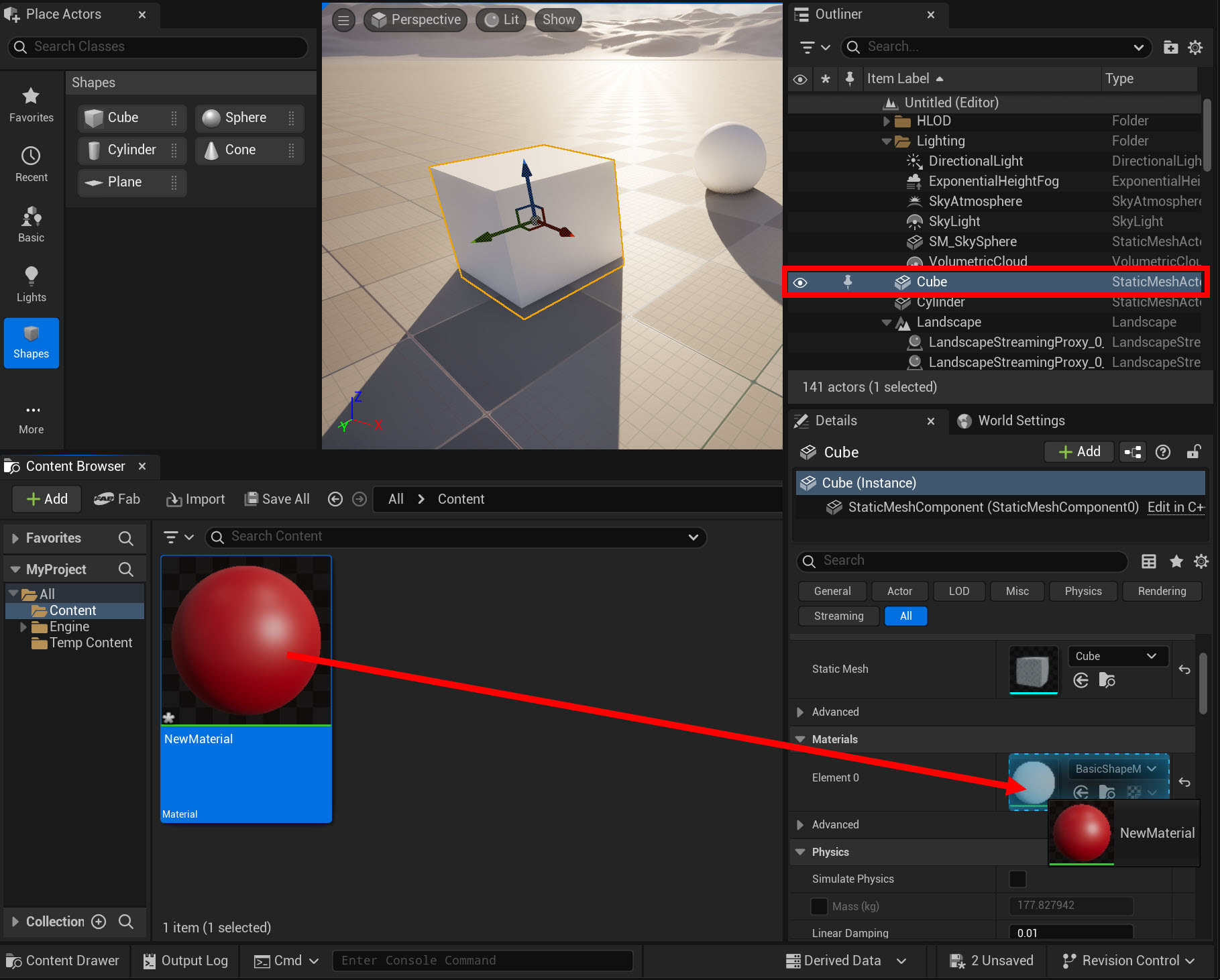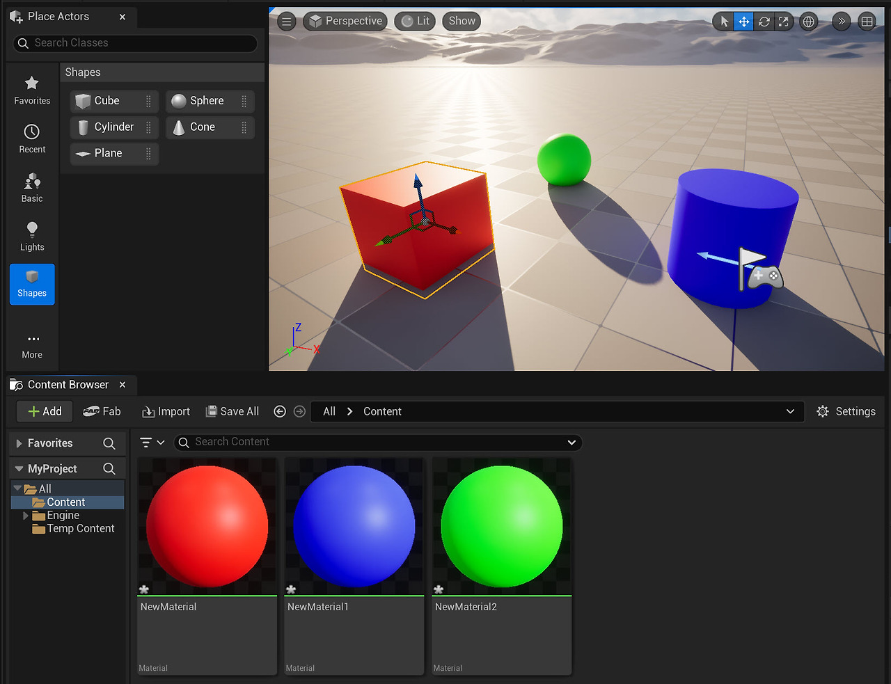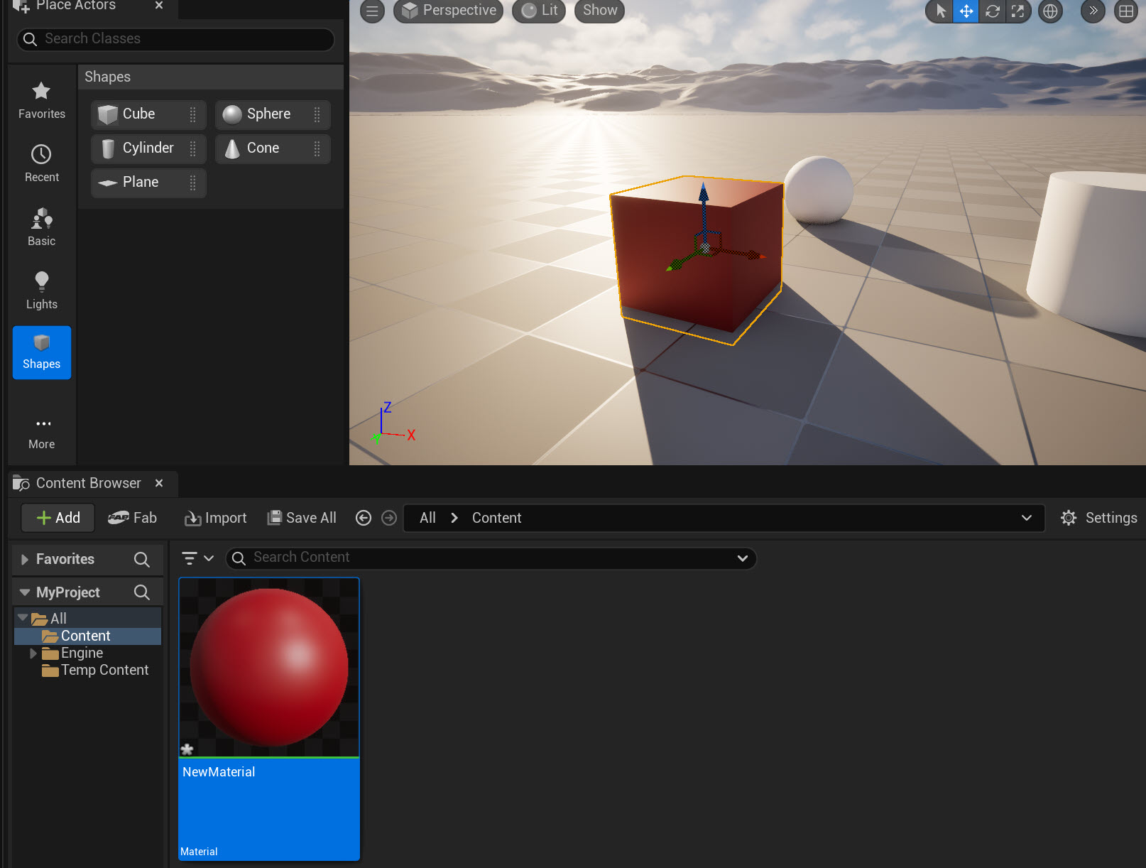 언리얼 엔진(Unreal Engine) 레벨에 액터(Cube, Sphere) 생성하고 재질 할당하기
