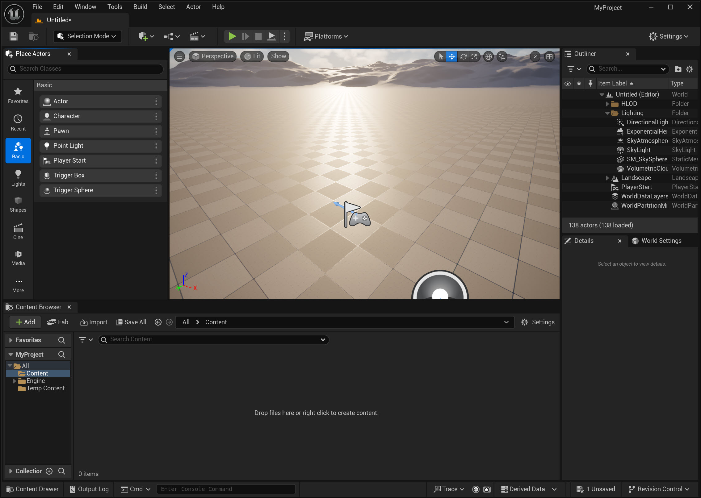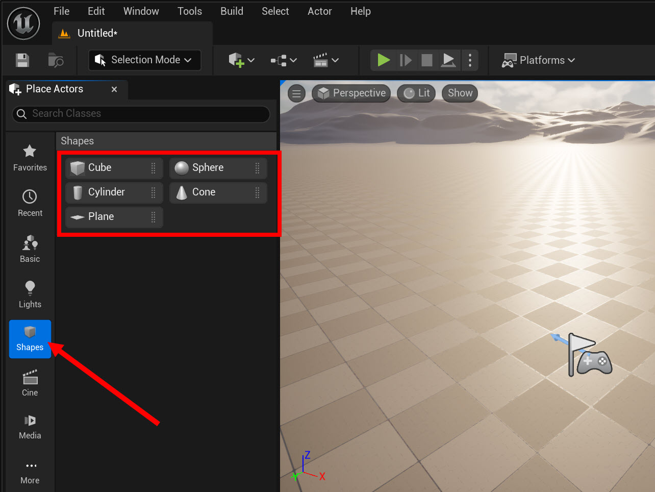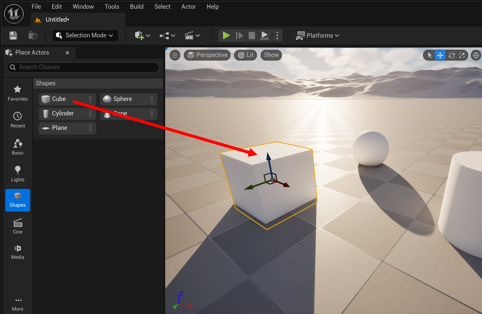 4)3D 큐브 및 스피어를 생성하려면 shapes에서 액터를 뷰포트로 클릭 드래그합니다.