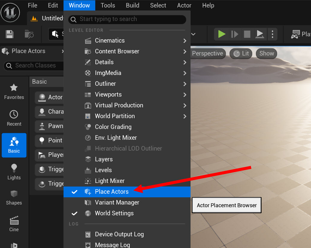 2)상단의 window에서 Place Actors를 선택합니다.