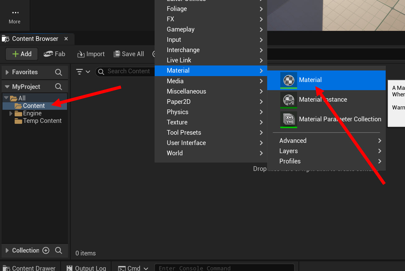 5)콘텐츠 브라우저에서(Content Browser) 마우스 우클릭하고 Material의 Material를 선택합니다.