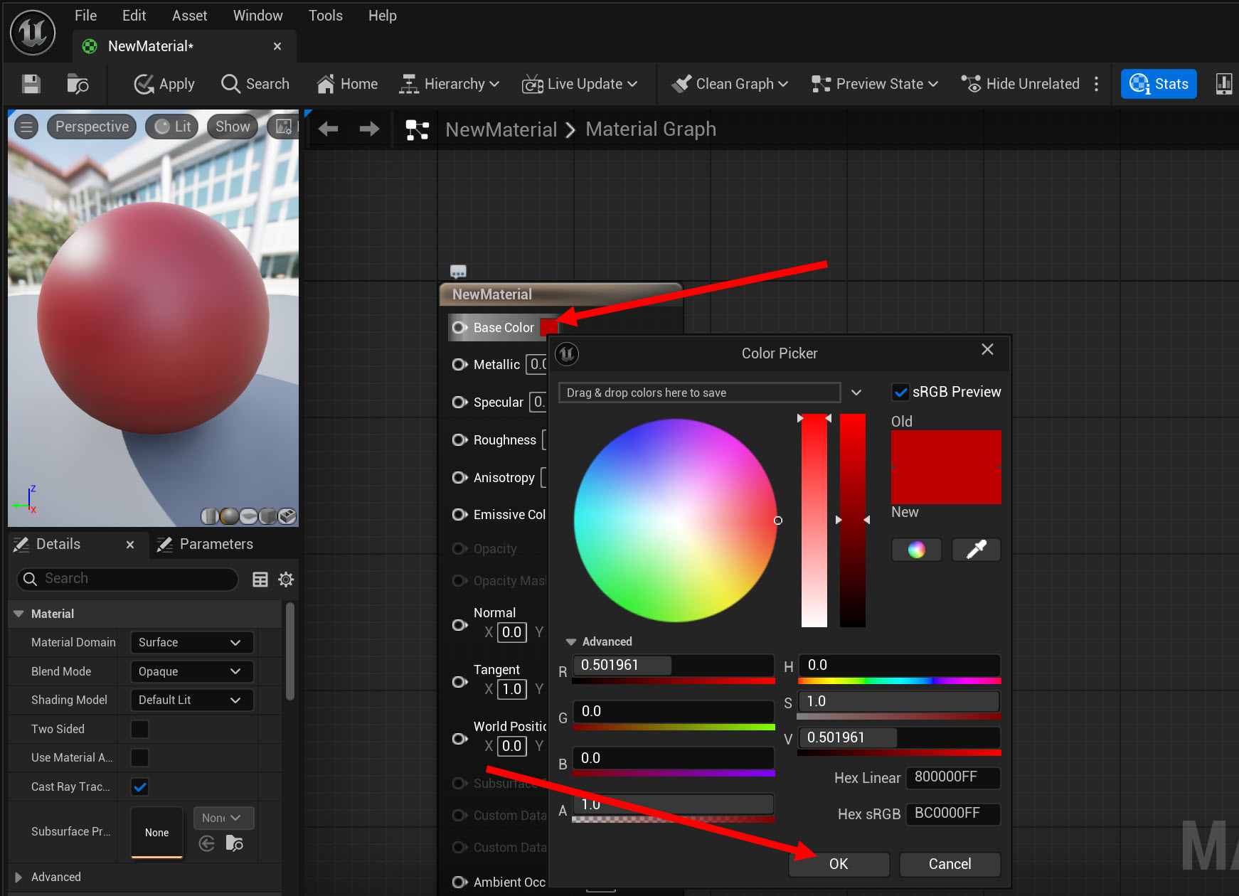 8)재질 편집기( Material Editor)에서 해당 재질의 기본 색상(base color) 및 기타 속성을 수정합니다.