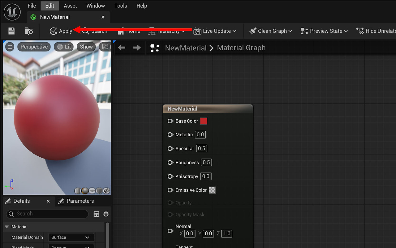 9)재질 편집기 상단의 apply 버튼을 클릭하면 수정한 재질을 적용하며 레벨 또는 액터에서 해당 재질의 변경사항이 반영됩니다(실시간 적용을 통해 수정 결과를 즉시 확인)