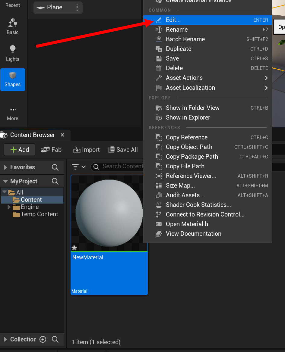 5)콘텐츠 브라우저에서(Content Browser) 마우스 우클릭하고 Material의 Material를 선택합니다.