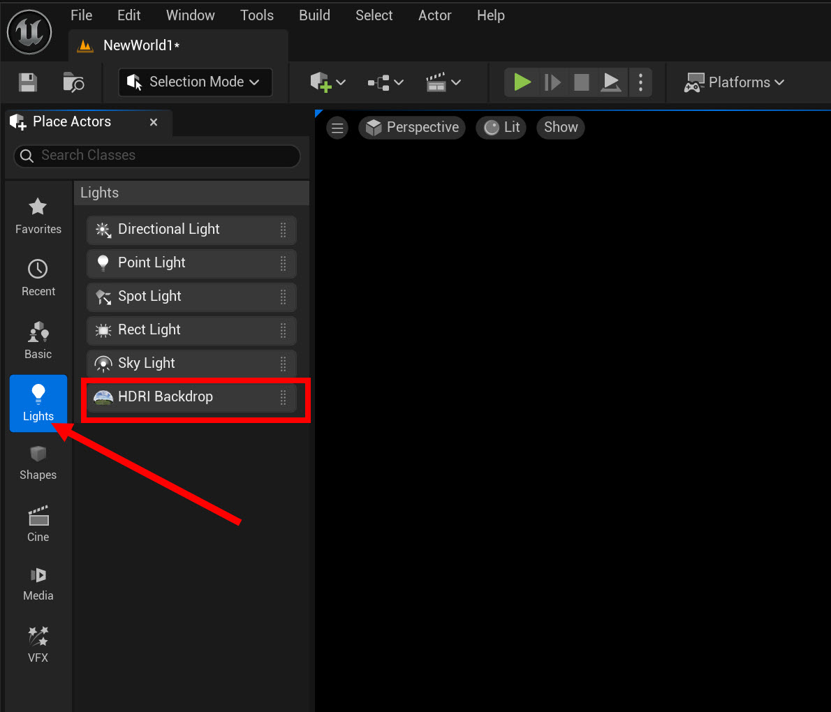 2)Place Actors의 조명(Lights)에서 HDRI Backdrop를 확인할수있습니다.