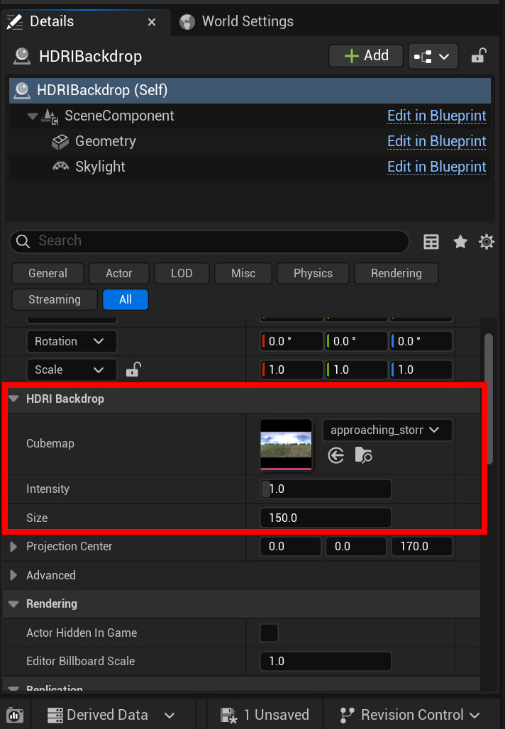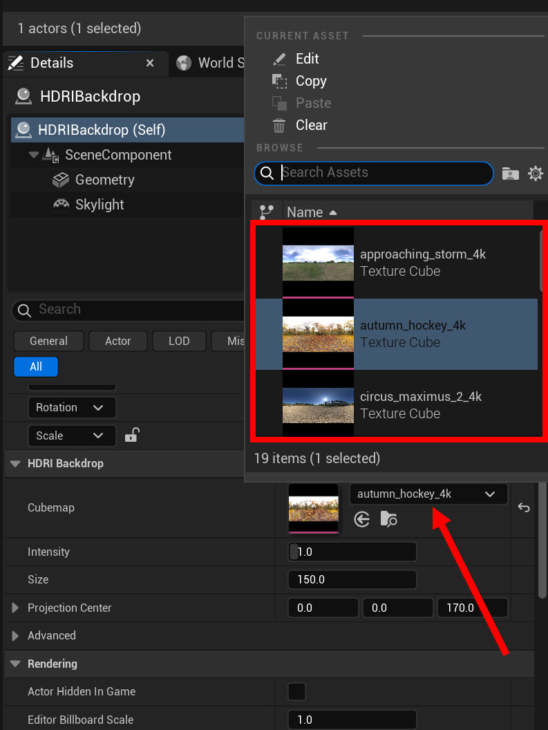 4)HDRI Backdrop 액터를 선택하고 Details 패널의 HDRI Backdrop에서 큐브맵, 강도, 크기를 설정합니다.