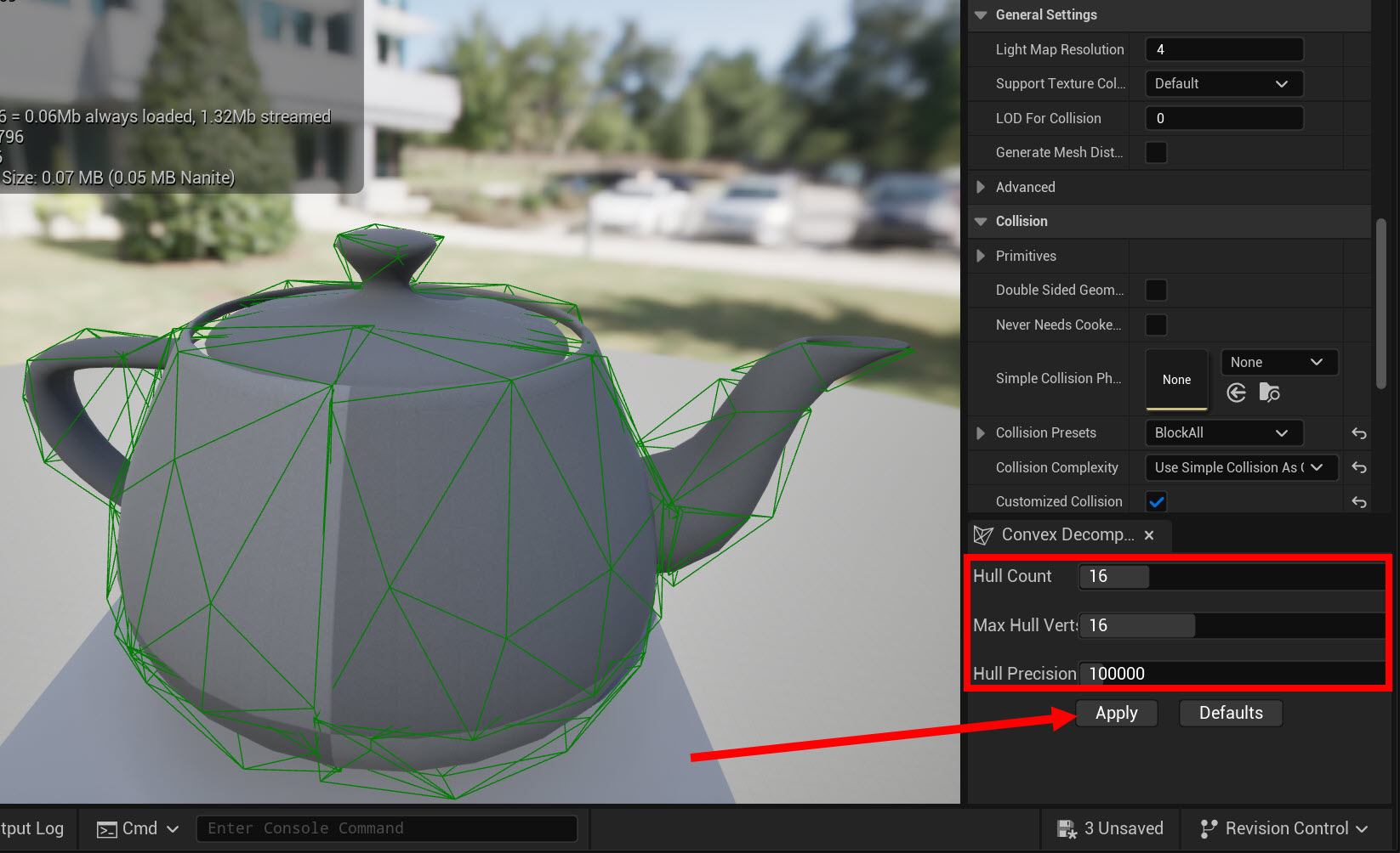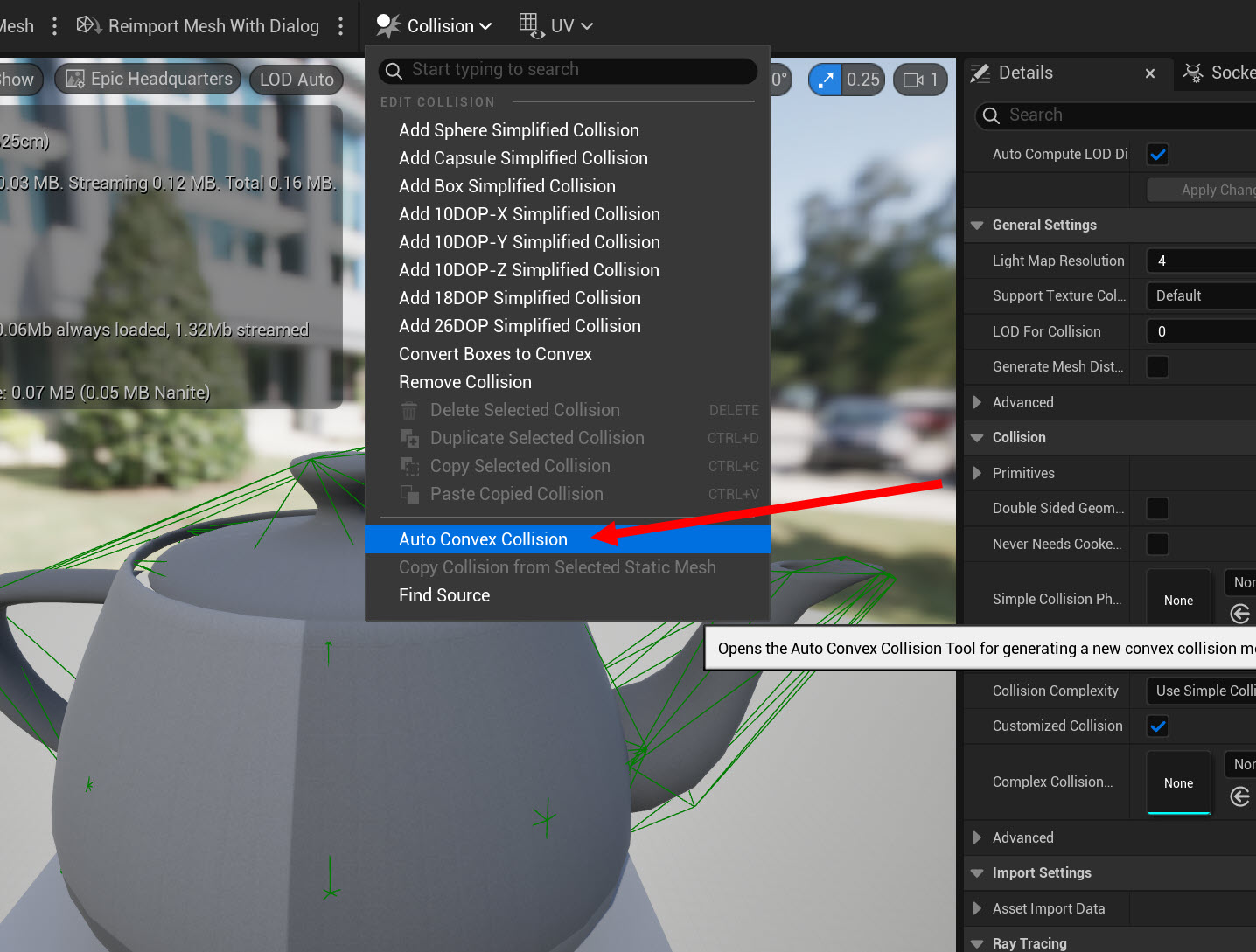 8)collision의 auto convex collision을 선택하면 details 패널 하단에 auto convex collision 툴을 표시합니다.