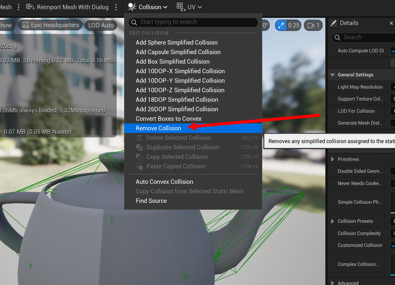 7)collision의 remove collision을 선택하면 현재 메시의 단순한 콜리전(simple collision)을 제거합니다.