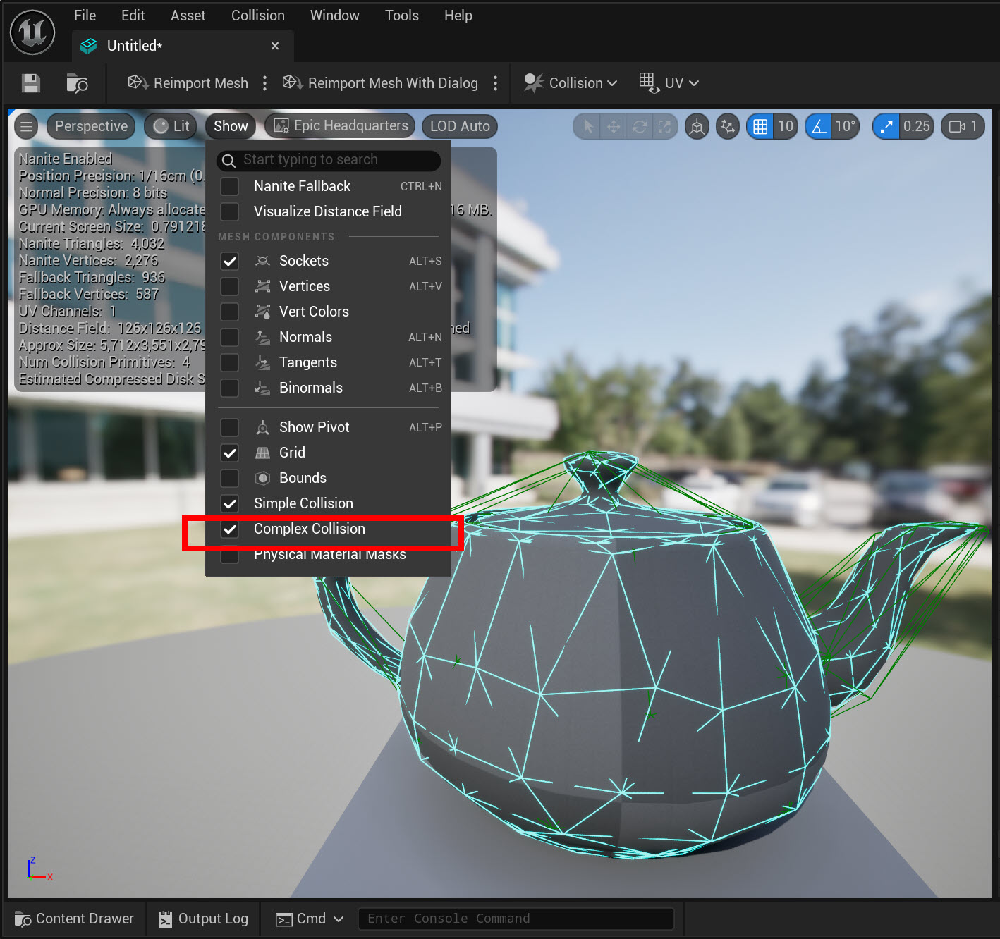 4)show의 complex collision에 체크하면 3D 모델의 복잡한 충돌 구현을 위한 콜리전을 표시하는것을 확인할수있습니다(complex collision)
