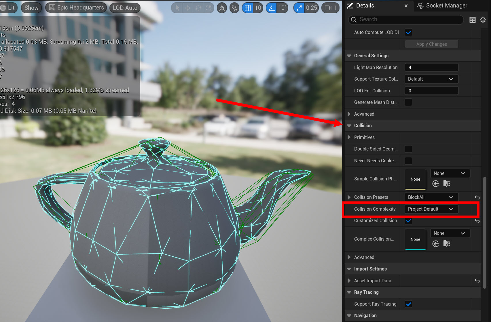5)Detials 패널에서 콜리전(Collision)의 Collision Complexity를 확인합니다. 프로젝트 기본값(project default)으로 설정되어있는것을 확인할수있습니다.
