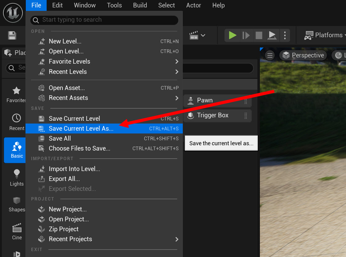 2)상단의 file 메뉴에서 save current level as를 선택합니다.