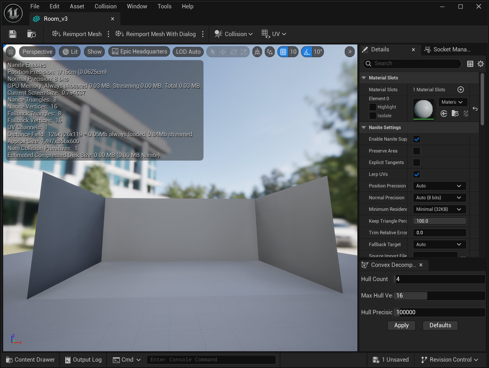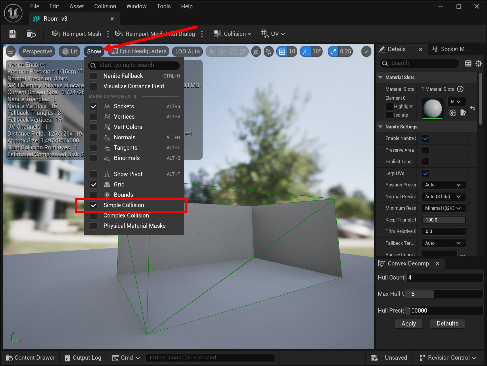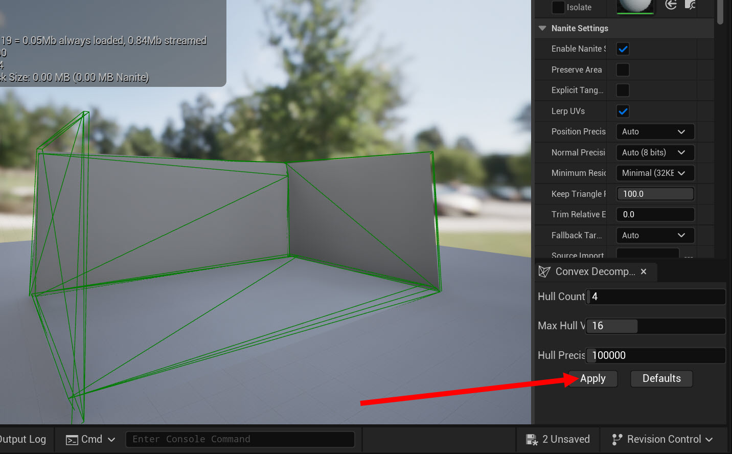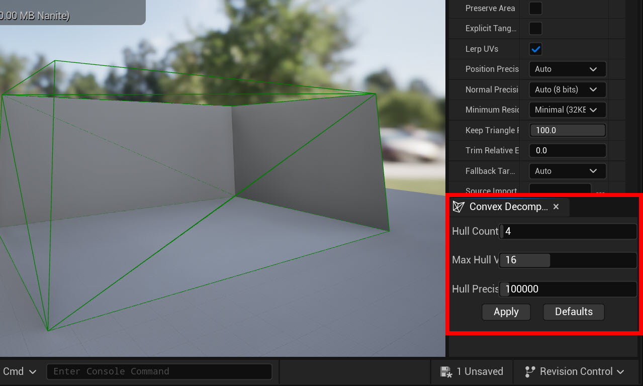 28)파라미터(Hull Count, Max Hull Vertex, Hull precision)를 설정하고 apply를 클릭하면 메시에 파라미터에서 설정한 콜리전 헐(Hull)을 사용한 새로운 메시 콜리젼을 확인할수있습니다.