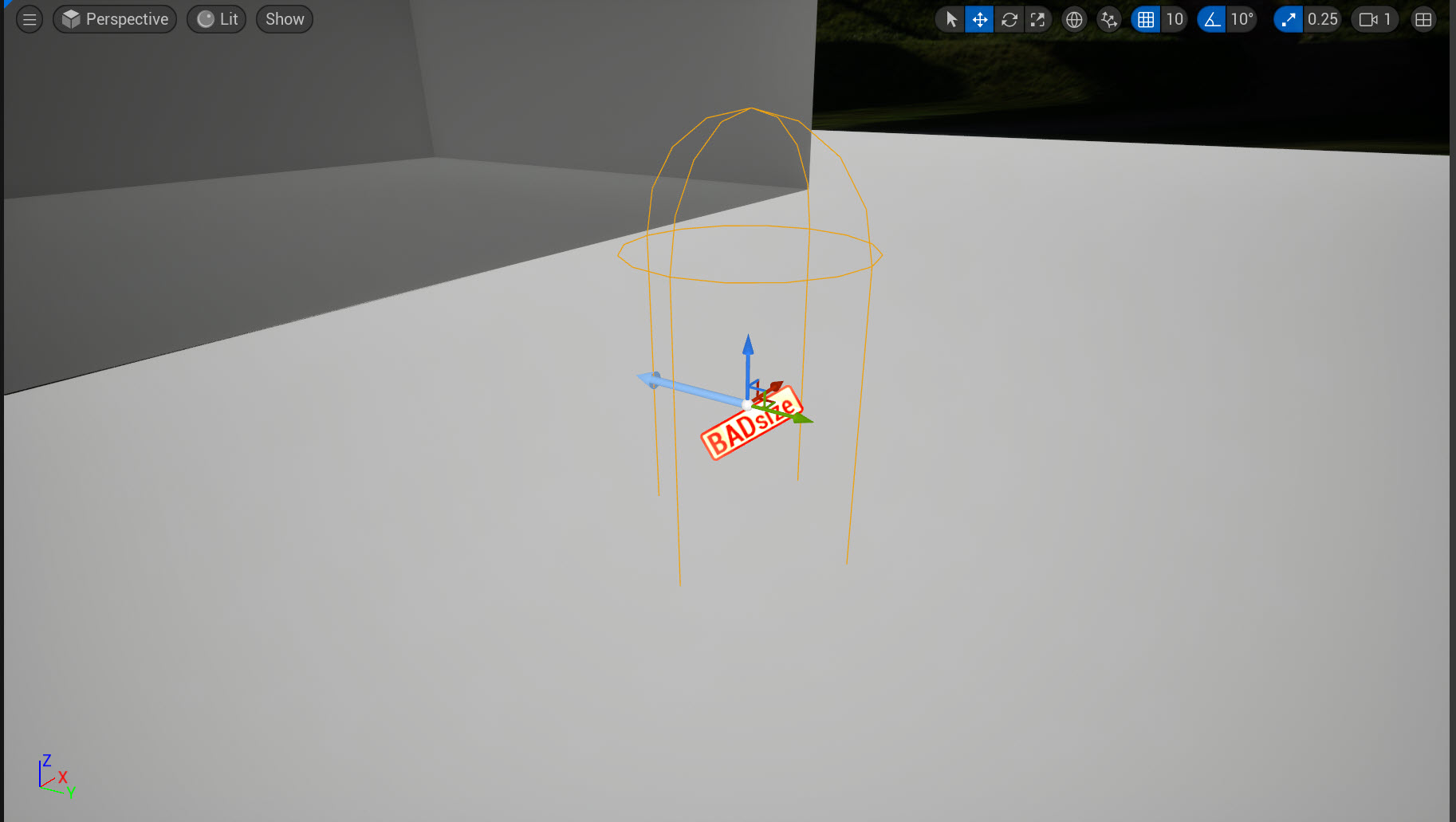 8)플레이어 액터의 캡슐(capsule) 콜리전(collision)이 레벨에 존재하는 다른 콜리전과 교차하면 Bad size를 표시합니다.