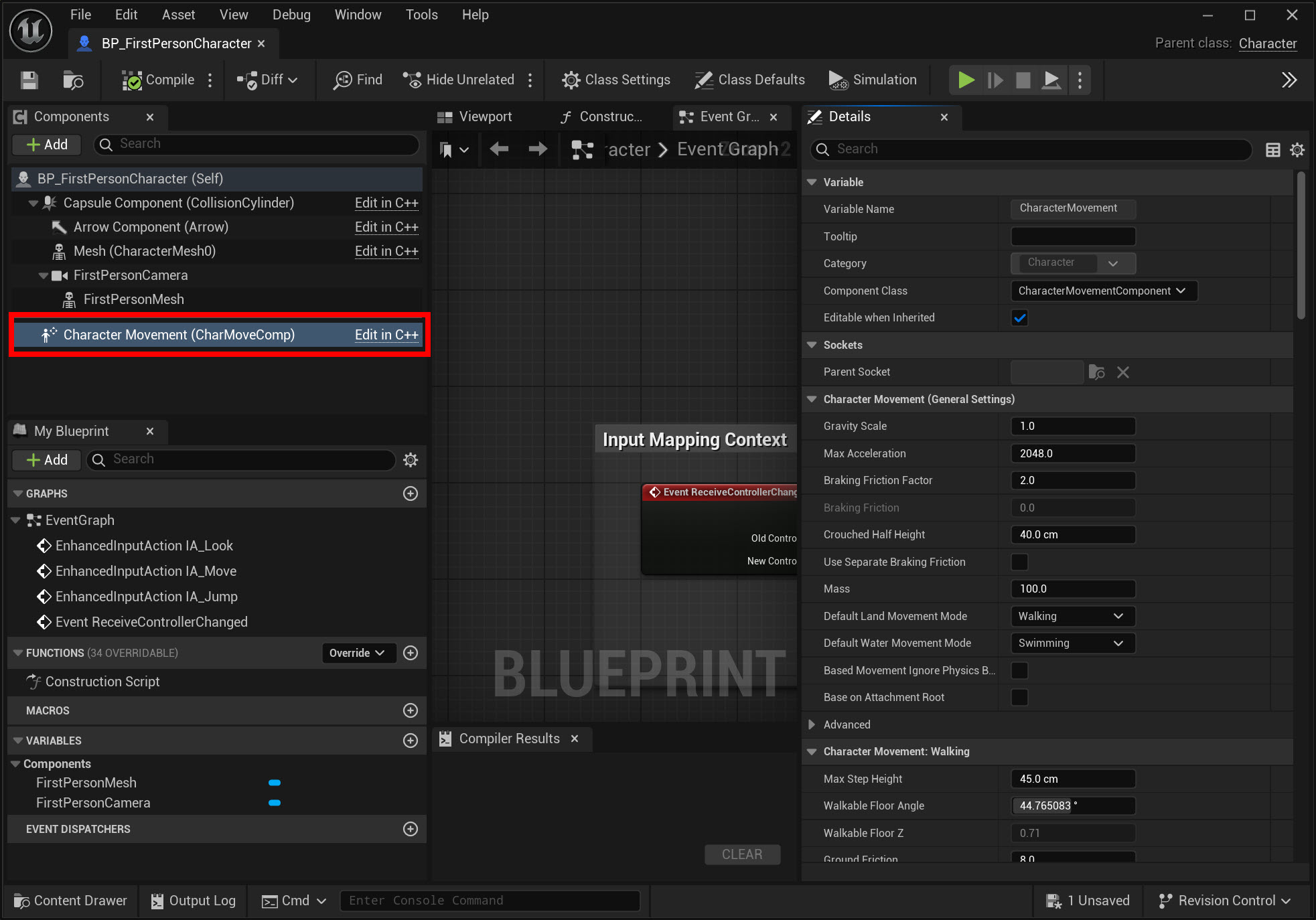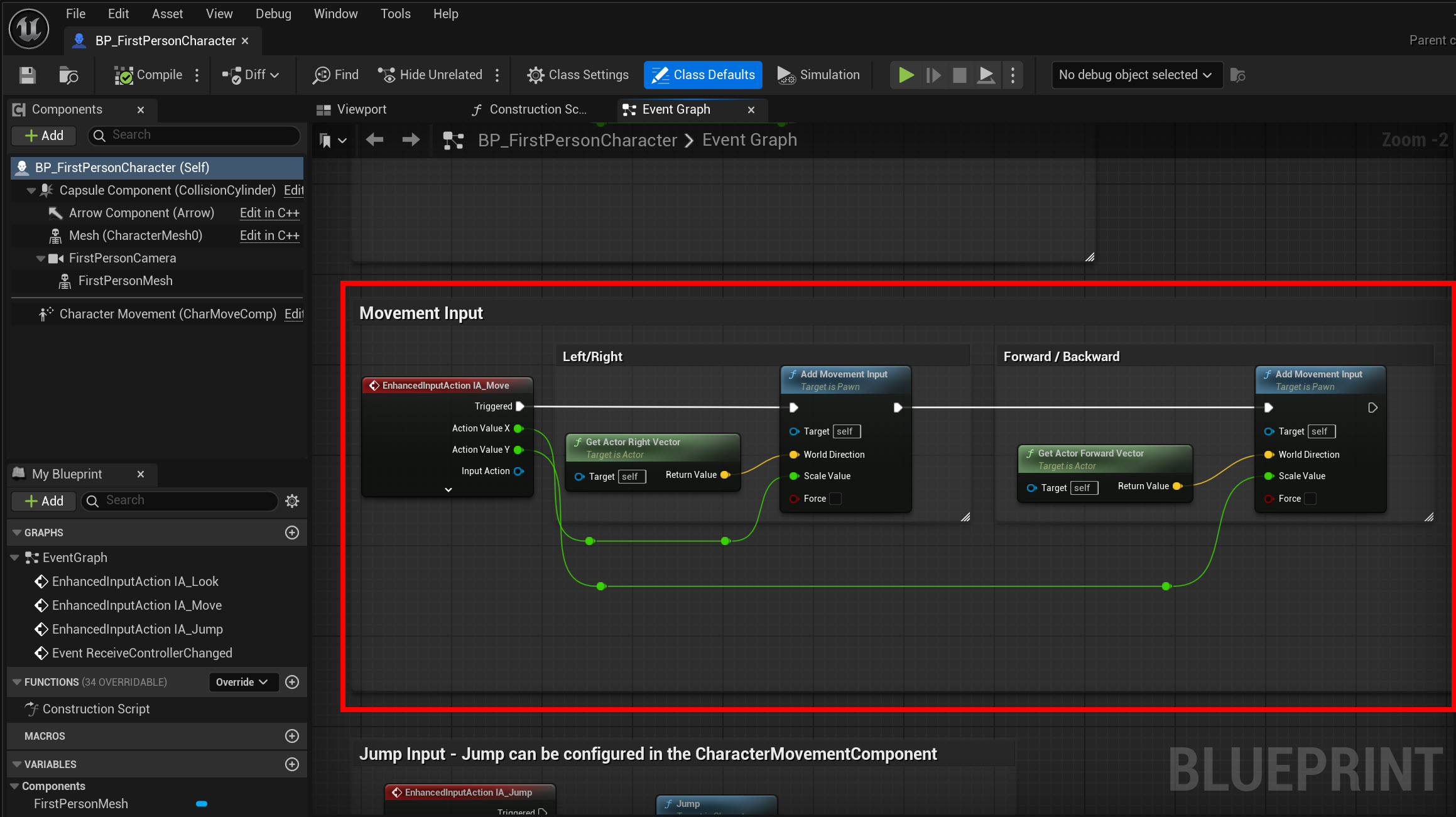 21)BP_FirstPersonCharacter의 블루프린트 편집기에서 1인칭 플레이어의 이동(Movement)을 구현하기위하여 사전설정된 구성요소들을 확인할수있습니다.