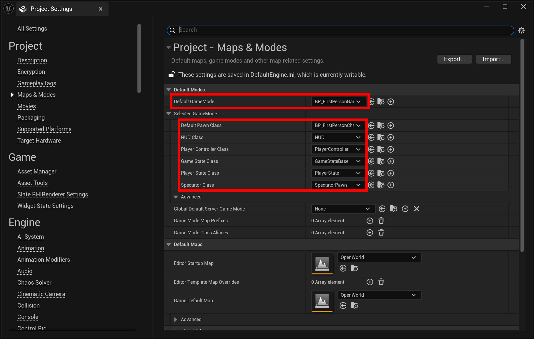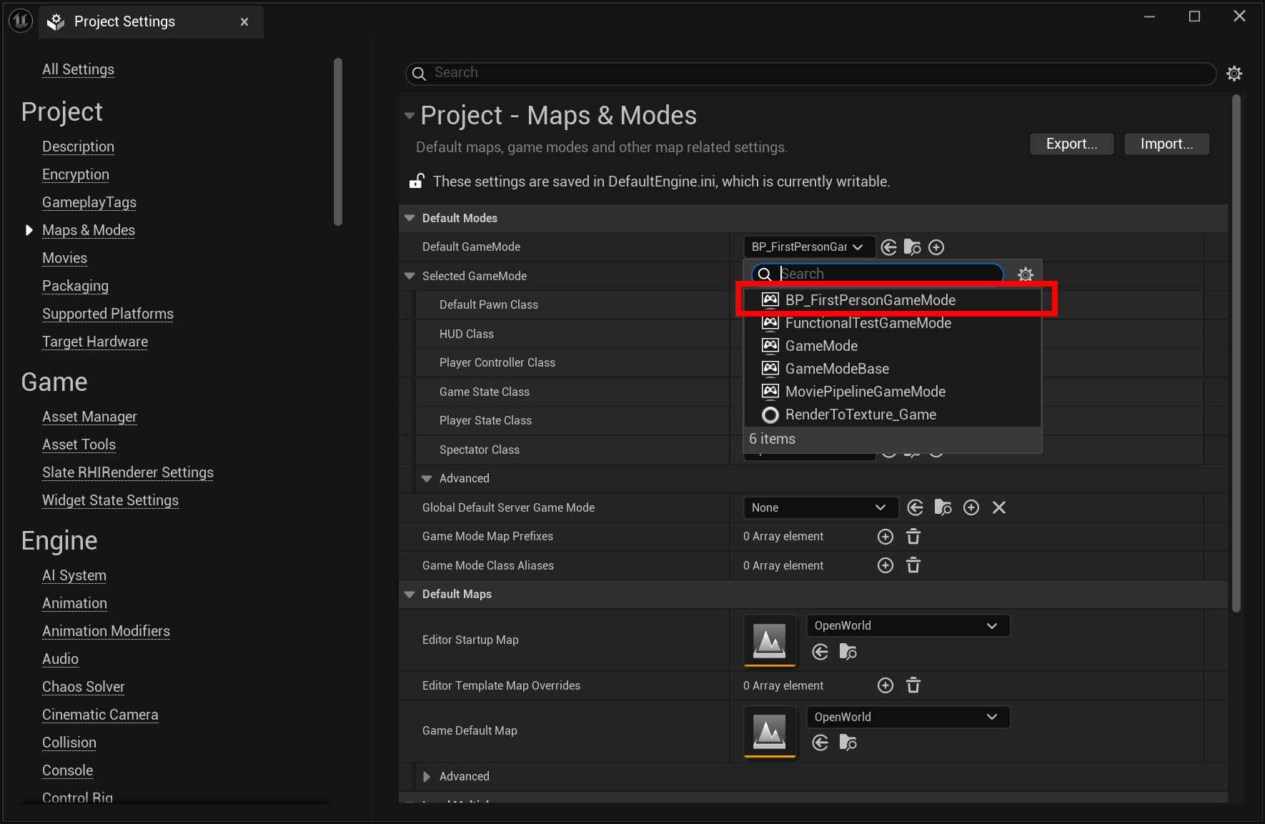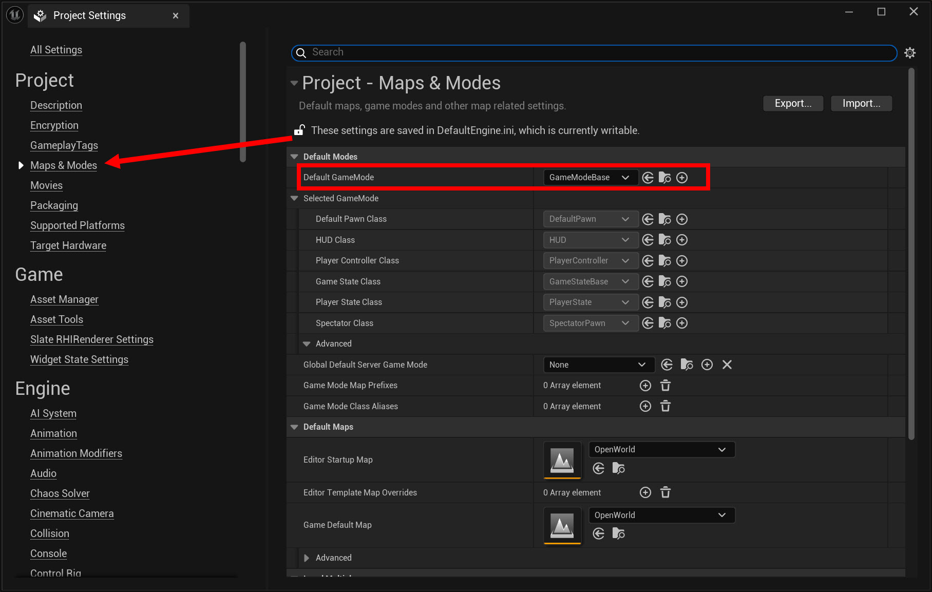 14)좌측의 Maps & Modes에서 Default GameModes를 확인합니다(GameModeBase)