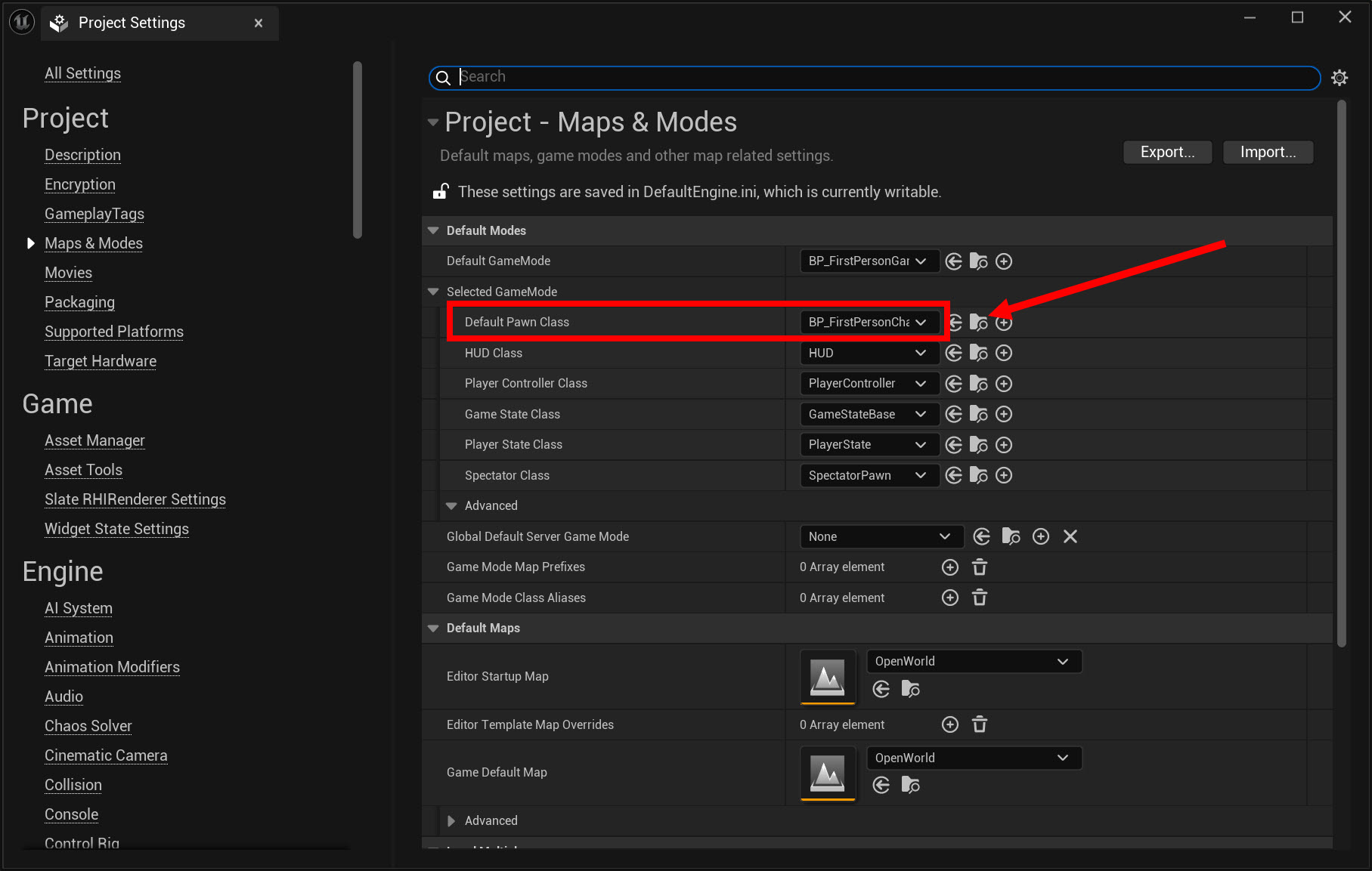 15)1인칭 게임모드를 사용하려면 Default GameModes를 BP_FirstPersonGameMode로 변경합니다.