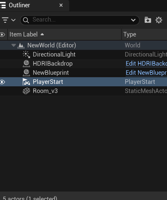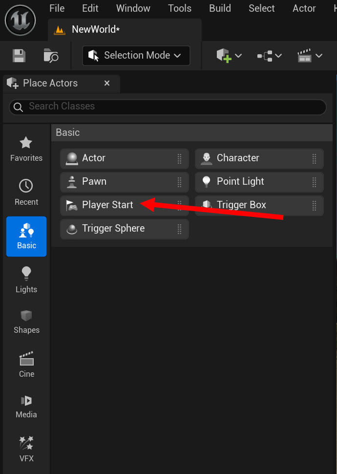6)Place Actors 패널에서 Player Start 액터를 선택 및 레벨에 추가합니다.