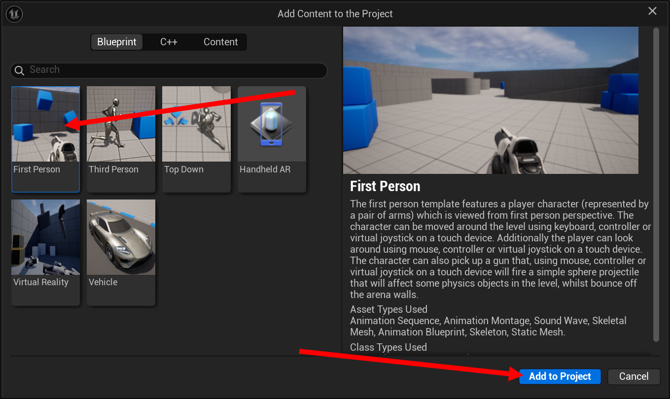 프로젝트에 1인칭(또는 3인칭) 플레이어 캐릭터 기능을 추가하려면 First Person(또는 Third Person) 템플릿을 선택합니다.
