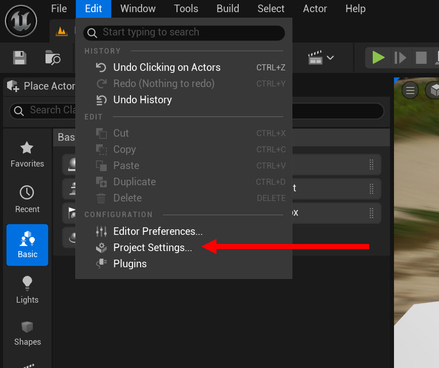 13)상단의 edit 메뉴에서 프로젝트 설정(project settings)로 이동합니다.