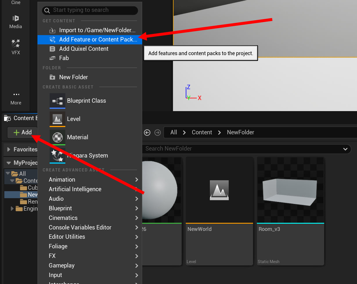 16)콘텐츠 브라우저 패널의 add 버튼을 클릭하고 add feature or content packs를 선택합니다.