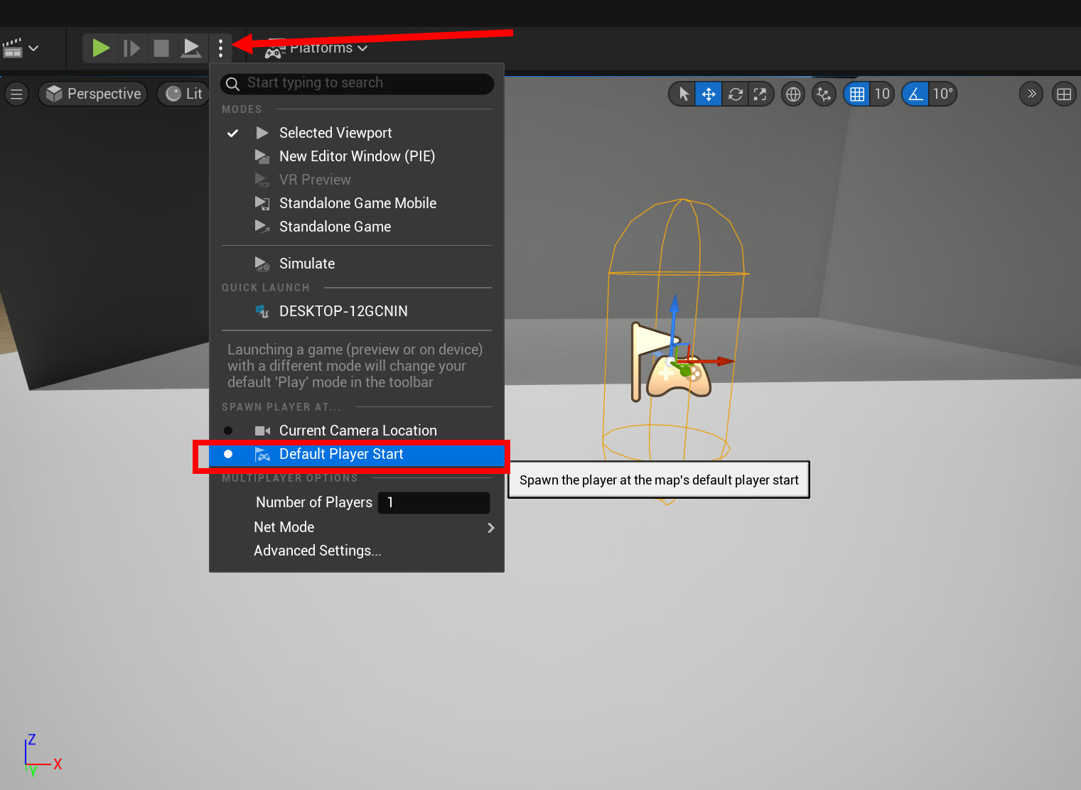 이 옵션에 체크하면 게임 플레이가 시작될때 플레이어를 Player Start 액터의 위치에 생성합니다(current camera location에 체크하면 게임 플레이가 시작될때 플레이어를 현재 카메라 위치에 생성합니다)