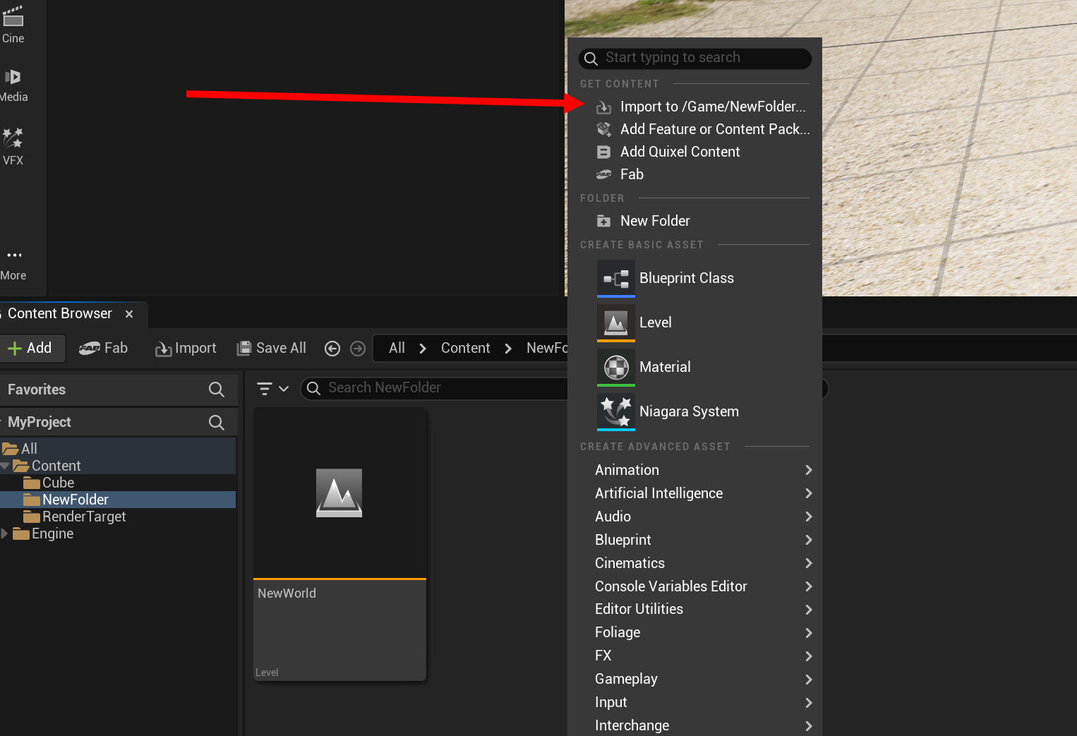 2)프로젝트에 새로운 콘텐츠 및 에셋을 가져오기하려면 콘텐츠 브라우저에서 마우스 우클릭하고 import to 를 선택합니다.