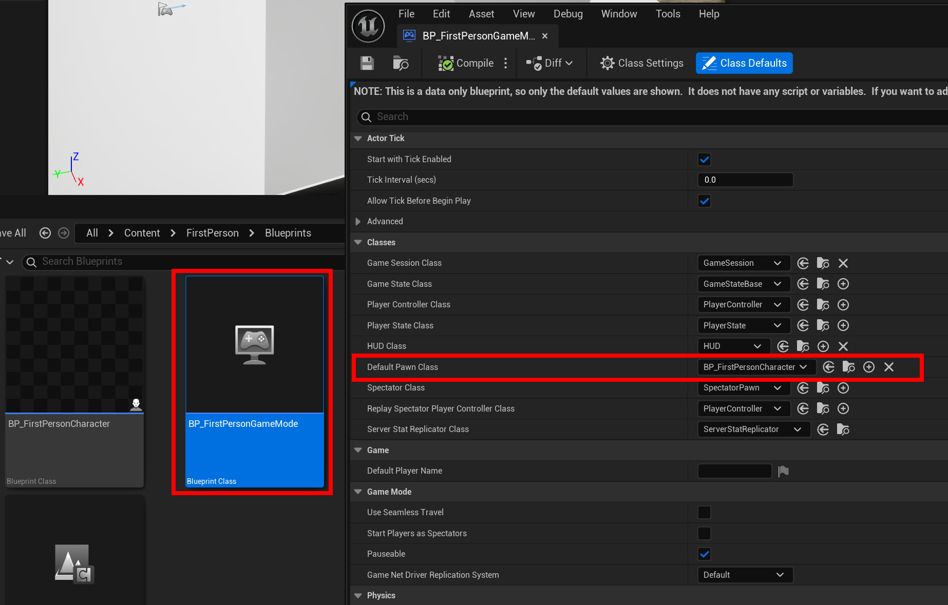 해당 게임모드( BP_FirstPersonGameMode)에 사전 설정된 클래스들을 확인합니다.