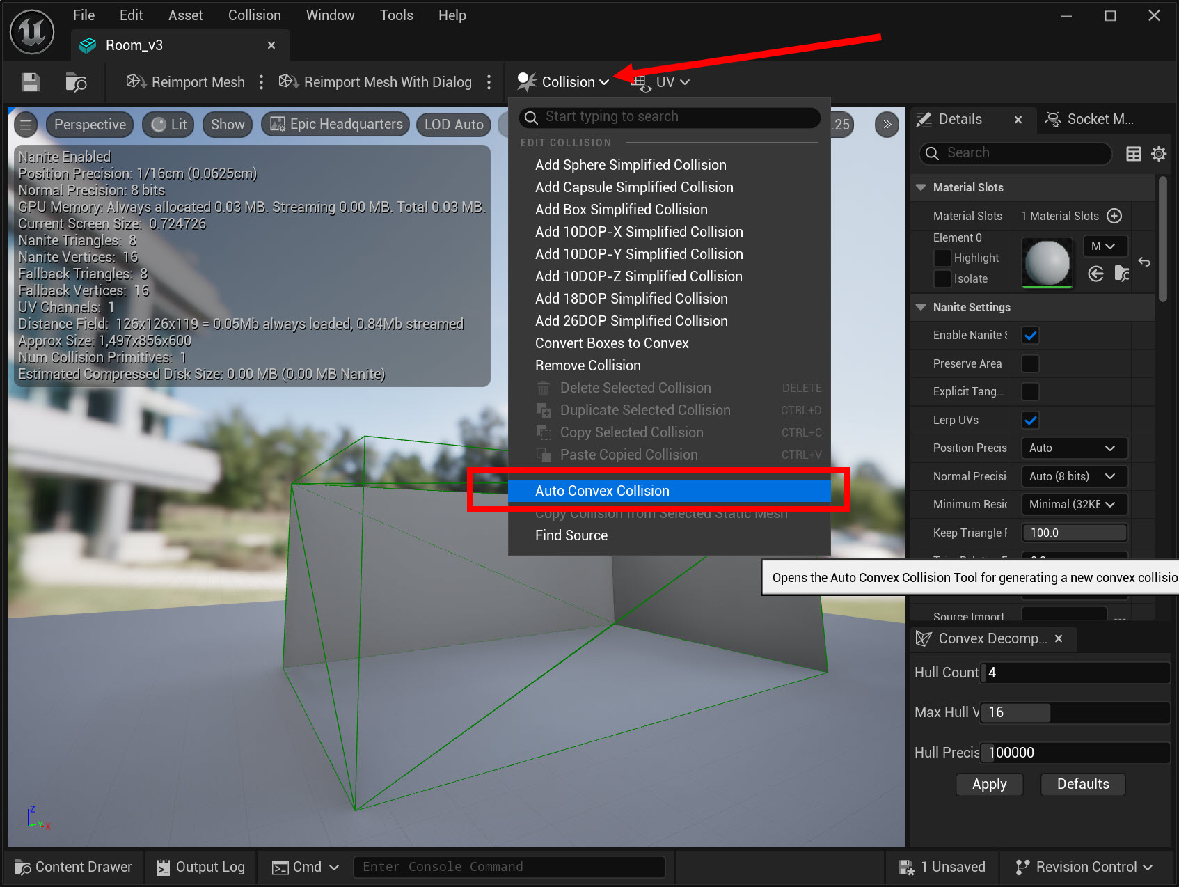 27)Details 패널 하단에서 자동 컨벡스 콜리전 툴(auto convex collision)을 표시하는것을 확인할수있습니다.