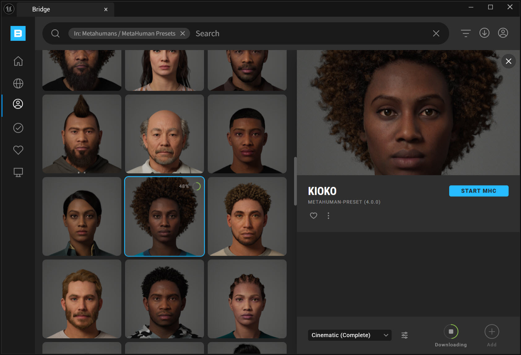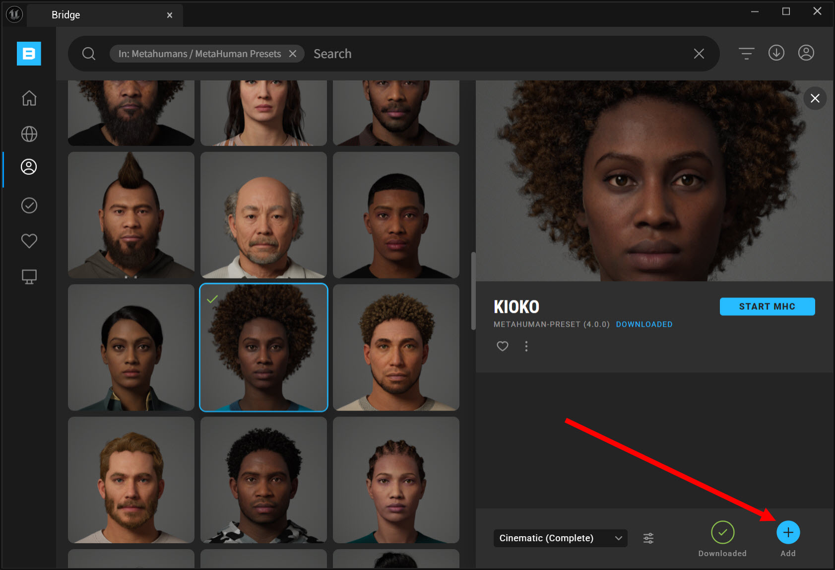 4)다운로드가 완료되면 add버튼이 활성화됩니다. add 버튼을 클릭하여 해당 메타휴먼을 언리얼 엔진 콘텐츠에 추가합니다.
