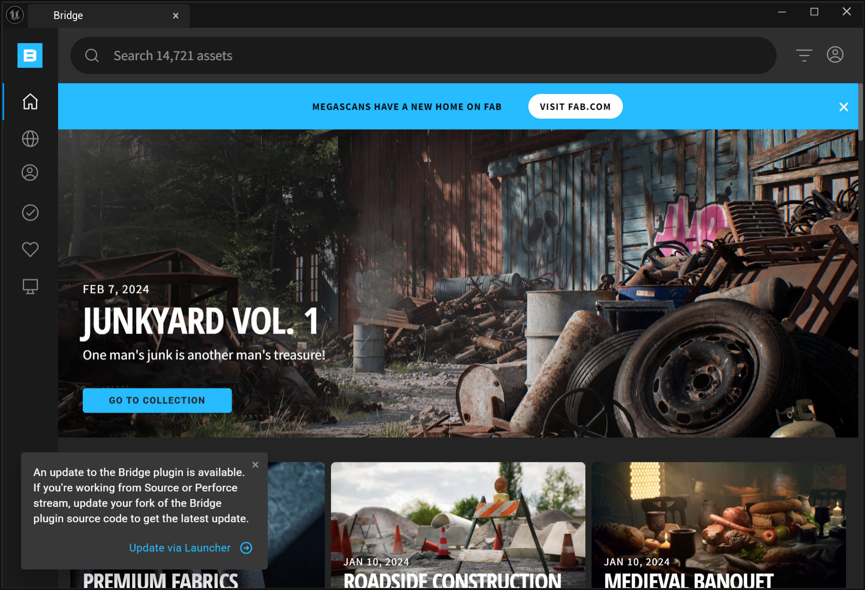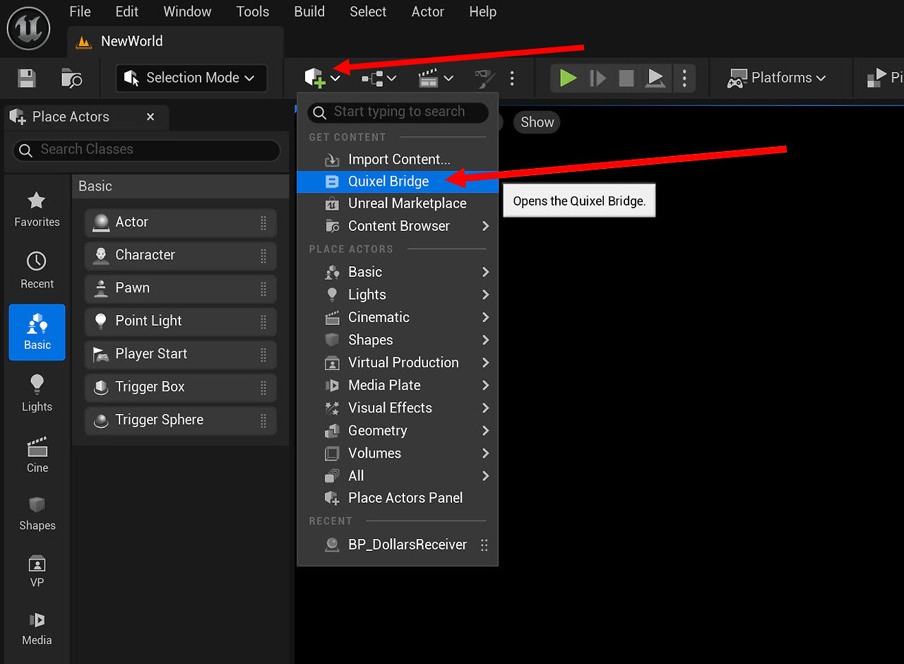 1)아래 표시한곳을 클릭하고 퀵셀 브릿지(Quixel Bridge)로 이동합니다.